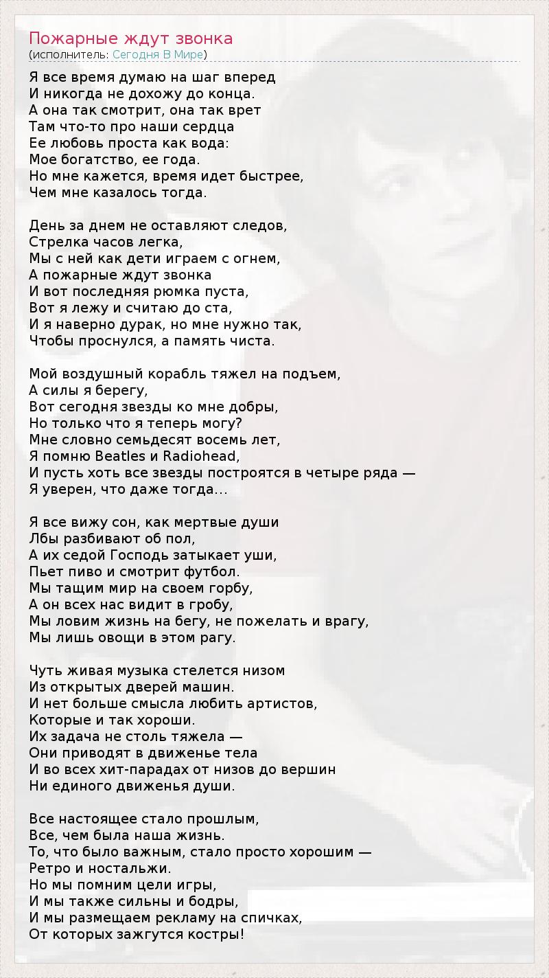 Я все время думаю на шаг вперед И никогда не дохожу до конца. А она так смотрит, она так врет Там что-то про наши сердца Ее любовь проста как вода: Мое богатство, ее года. Но мне кажется, время идет быстрее, Чем мне казалось тогда. День за днем не оставляют следов, Стрелка часов легка, Мы с ней как дети играем с огнем, А пожарные ждут звонка И вот последняя рюмка пуста, Вот я лежу и считаю до ста, И я наверно дурак, но мне нужно так, Чтобы проснулся, а память чиста. Мой воздушный корабль тяжел на подъем, А силы я берегу, Вот сегодня звезды ко мне добры, Но только что я теперь могу? Мне словно семьдесят восемь лет, Я помню Beatles и Radiohead, И пусть хоть все звезды построятся в четыре ряда — Я уверен, что даже тогда… Я все вижу сон, как мертвые души Лбы разбивают об пол, А их седой Господь затыкает уши, Пьет пиво и смотрит футбол. Мы тащим мир на своем горбу, А он всех нас видит в гробу, Мы ловим жизнь на бегу, не пожелать и врагу, Мы лишь овощи в этом рагу. Чуть живая музыка стелется низом Из открытых дверей машин. И нет больше смысла любить артистов, Которые и так хороши. Их задача не столь тяжела — Они приводят в движенье тела И во всех хит-парадах от низов до вершин Ни единого движенья души. Все настоящее стало прошлым, Все, чем была наша жизнь. То, что было важным, стало просто хорошим — Ретро и ностальжи. Но мы помним цели игры, И мы также сильны и бодры, И мы размещаем рекламу на спичках, От которых зажгутся костры!