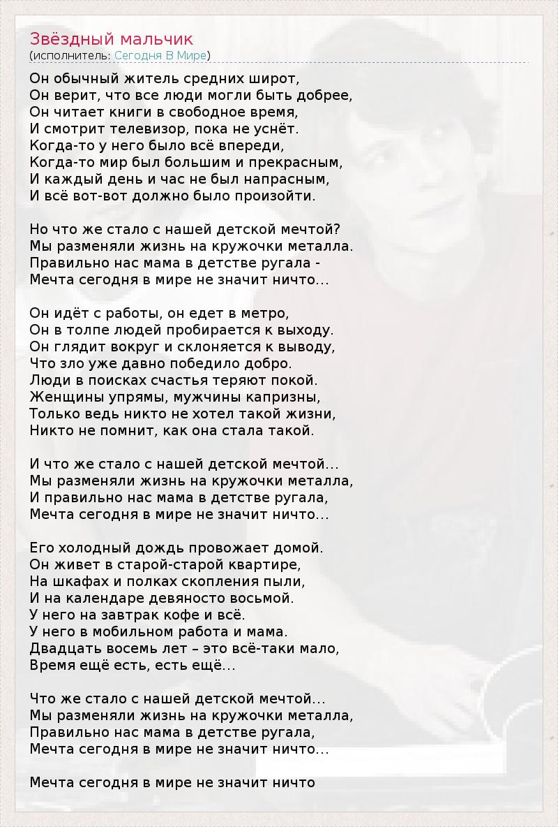 Он обычный житель средних широт, Он верит, что все люди могли быть добрее, Он читает книги в свободное время, И смотрит телевизор, пока не уснёт. Когда-то у него было всё впереди, Когда-то мир был большим и прекрасным, И каждый день и час не был напрасным, И всё вот-вот должно было произойти. Но что же стало с нашей детской мечтой? Мы разменяли жизнь на кружочки металла. Правильно нас мама в детстве ругала - Мечта сегодня в мире не значит ничто… Он идёт с работы, он едет в метро, Он в толпе людей пробирается к выходу. Он глядит вокруг и склоняется к выводу, Что зло уже давно победило добро. Люди в поисках счастья теряют покой. Женщины упрямы, мужчины капризны, Только ведь никто не хотел такой жизни, Никто не помнит, как она стала такой. И что же стало с нашей детской мечтой… Мы разменяли жизнь на кружочки металла, И правильно нас мама в детстве ругала, Мечта сегодня в мире не значит ничто… Его холодный дождь провожает домой. Он живет в старой-старой квартире, На шкафах и полках скопления пыли, И на календаре девяносто восьмой. У него на завтрак кофе и всё. У него в мобильном работа и мама. Двадцать восемь лет – это всё-таки мало, Время ещё есть, есть ещё… Что же стало с нашей детской мечтой… Мы разменяли жизнь на кружочки металла, Правильно нас мама в детстве ругала, Мечта сегодня в мире не значит ничто… Мечта сегодня в мире не значит ничто