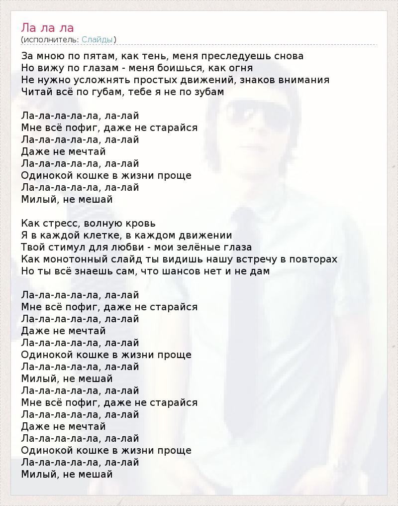 За мною по пятам, как тень, меня преследуешь снова Но вижу по глазам - меня боишься, как огня Не нужно усложнять простых движений, знаков внимания Читай всё по губам, тебе я не по зубам Ла-ла-ла-ла-ла, ла-лай Мне всё пофиг, даже не старайся Ла-ла-ла-ла-ла, ла-лай Даже не мечтай Ла-ла-ла-ла-ла, ла-лай Одинокой кошке в жизни проще Ла-ла-ла-ла-ла, ла-лай Милый, не мешай Как стресс, волную кровь Я в каждой клетке, в каждом движении Твой стимул для любви - мои зелёные глаза Как монотонный слайд ты видишь нашу встречу в повторах Но ты всё знаешь сам, что шансов нет и не дам Ла-ла-ла-ла-ла, ла-лай Мне всё пофиг, даже не старайся Ла-ла-ла-ла-ла, ла-лай Даже не мечтай Ла-ла-ла-ла-ла, ла-лай Одинокой кошке в жизни проще Ла-ла-ла-ла-ла, ла-лай Милый, не мешай Ла-ла-ла-ла-ла, ла-лай Мне всё пофиг, даже не старайся Ла-ла-ла-ла-ла, ла-лай Даже не мечтай Ла-ла-ла-ла-ла, ла-лай Одинокой кошке в жизни проще Ла-ла-ла-ла-ла, ла-лай Милый, не мешай