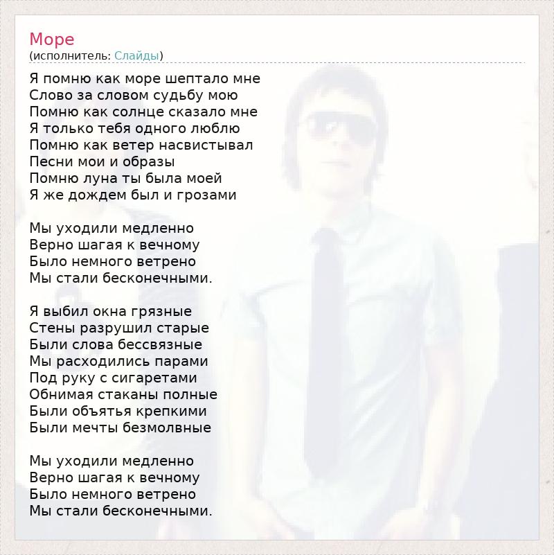 Я помню как море шептало мне Слово за словом судьбу мою Помню как солнце сказало мне Я только тебя одного люблю Помню как ветер насвистывал Песни мои и образы Помню луна ты была моей Я же дождем был и грозами Мы уходили медленно Верно шагая к вечному Было немного ветрено Мы стали бесконечными. Я выбил окна грязные Стены разрушил старые Были слова бессвязные Мы расходились парами Под руку с сигаретами Обнимая стаканы полные Были объятья крепкими Были мечты безмолвные Мы уходили медленно Верно шагая к вечному Было немного ветрено Мы стали бесконечными.
