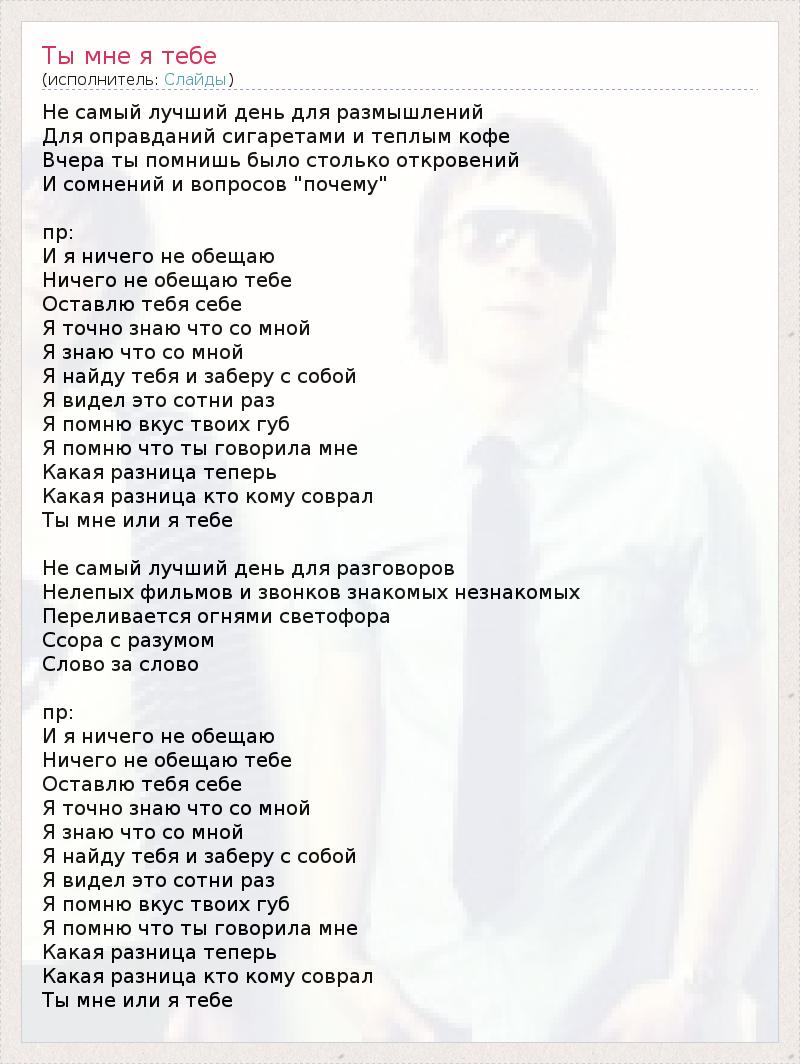 Не самый лучший день для размышлений Для оправданий сигаретами и теплым кофе Вчера ты помнишь было столько откровений И сомнений и вопросов "почему" пр: И я ничего не обещаю Ничего не обещаю тебе Оставлю тебя себе Я точно знаю что со мной Я знаю что со мной Я найду тебя и заберу с собой Я видел это сотни раз Я помню вкус твоих губ Я помню что ты говорила мне Какая разница теперь Какая разница кто кому соврал Ты мне или я тебе Не самый лучший день для разговоров Нелепых фильмов и звонков знакомых незнакомых Переливается огнями светофора Ссора с разумом Слово за слово пр: И я ничего не обещаю Ничего не обещаю тебе Оставлю тебя себе Я точно знаю что со мной Я знаю что со мной Я найду тебя и заберу с собой Я видел это сотни раз Я помню вкус твоих губ Я помню что ты говорила мне Какая разница теперь Какая разница кто кому соврал Ты мне или я тебе