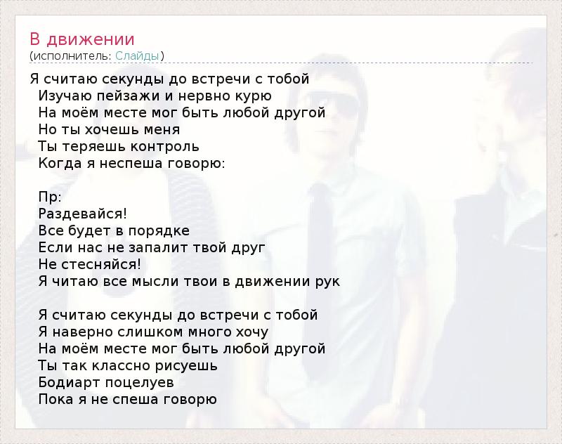 Я считаю секунды до встречи с тобой Изучаю пейзажи и нервно курю На моём месте мог быть любой другой Но ты хочешь меня Ты теряешь контроль Когда я неспеша говорю: Пр: Раздевайся! Все будет в порядке Если нас не запалит твой друг Не стесняйся! Я читаю все мысли твои в движении рук Я считаю секунды до встречи с тобой Я наверно слишком много хочу На моём месте мог быть любой другой Ты так классно рисуешь Бодиарт поцелуев Пока я не спеша говорю