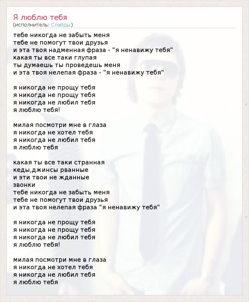 тебе никогда не забыть меня тебе не помогут твои друзья и эта твоя надменная фраза - "я ненавижу тебя" какая ты все таки глупая ты думаешь ты проведешь меня и эта твоя нелепая фраза - "я ненавижу тебя" я никогда не прощу тебя я никогда не прощу тебя я никогда не любил тебя я люблю тебя! милая посмотри мне в глаза я никогда не хотел тебя я никогда не любил тебя я люблю тебя какая ты все таки странная кеды,джинсы рванные и эти твои не жданные звонки тебе никогда не забыть меня тебе не помогут твои друзья и эта твоя нелепая фраза "я ненавижу тебя" я никогда не прощу тебя я никогда не прощу тебя я никогда не любил тебя я люблю тебя! милая посмотри мне в глаза я никогда не хотел тебя я никогда не любил тебя я люблю тебя