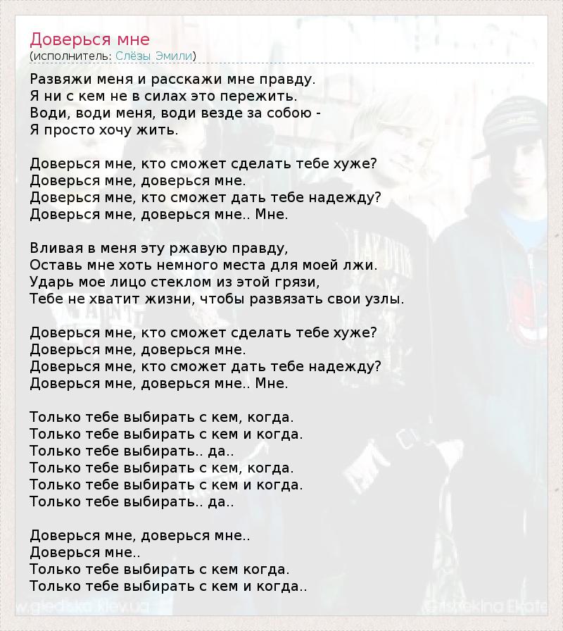 Развяжи меня и расскажи мне правду. Я ни с кем не в силах это пережить. Води, води меня, води везде за собою - Я просто хочу жить. Доверься мне, кто сможет сделать тебе хуже? Доверься мне, доверься мне. Доверься мне, кто сможет дать тебе надежду? Доверься мне, доверься мне.. Мне. Вливая в меня эту ржавую правду, Оставь мне хоть немного места для моей лжи. Ударь мое лицо стеклом из этой грязи, Тебе не хватит жизни, чтобы развязать свои узлы. Доверься мне, кто сможет сделать тебе хуже? Доверься мне, доверься мне. Доверься мне, кто сможет дать тебе надежду? Доверься мне, доверься мне.. Мне. Только тебе выбирать с кем, когда. Только тебе выбирать с кем и когда. Только тебе выбирать.. да.. Только тебе выбирать с кем, когда. Только тебе выбирать с кем и когда. Только тебе выбирать.. да.. Доверься мне, доверься мне.. Доверься мне.. Только тебе выбирать с кем когда. Только тебе выбирать с кем и когда..