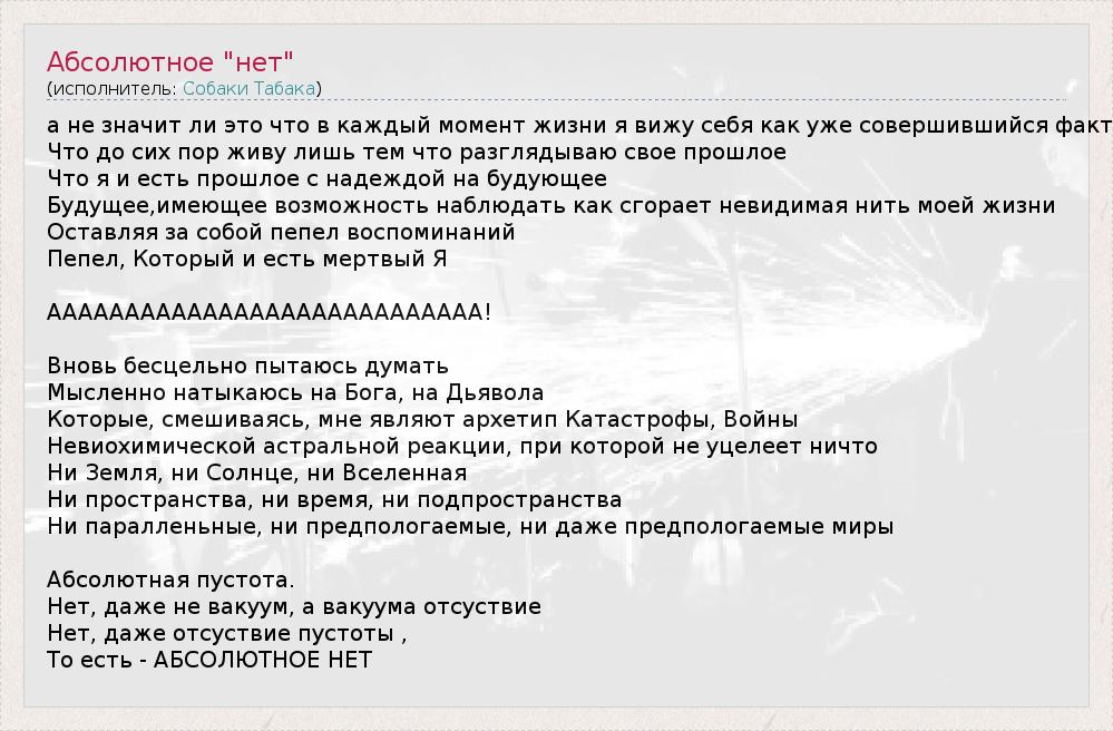 but does this mean that in every moment of my life, I see myself as an accomplished fact What still live only by the fact that I examine the past What I have a past with hope for future developments Future of having the opportunity to observe how burns invisible thread of my life Leaving behind the ashes of memories Ash, who is dead I AAAAAAAAAAAAAAAAAAAAAAAAAAAA! Again aimlessly trying to think Mentally I stumble toward God, the Devil Which, mixing, I is the archetype of the Holocaust, War Neviohimicheskoy astral reaction, in which nothing shall escape No earth, no sun, no universe Neither space nor time, nor the subspace No parallennye nor expected, nor even expected worlds The absolute emptiness. There is not even a vacuum, and the vacuum otsustvie No, not even places without voids That is - absolutely not