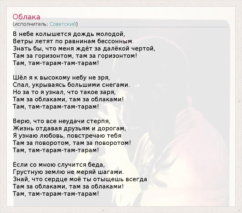 В небе колышется дождь молодой, Ветры летят по равнинам бессонным. Знать бы, что меня ждёт за далёкой чертой, Там за горизонтом, там за горизонтом! Там, там-тарам-там-тарам! Шёл я к высокому небу не зря, Спал, укрываясь большими снегами. Но за то я узнал, что такое заря, Там за облаками, там за облаками! Там, там-тарам-там-тарам! Верю, что все неудачи стерпя, Жизнь отдавая друзьям и дорогам, Я узнаю любовь, повстречаю тебя Там за поворотом, там за поворотом! Там, там-тарам-там-тарам! Если со мною случится беда, Грустную землю не меряй шагами. Знай, что сердце моё ты отыщешь всегда Там за облаками, там за облаками! Там, там-тарам-там-тарам!