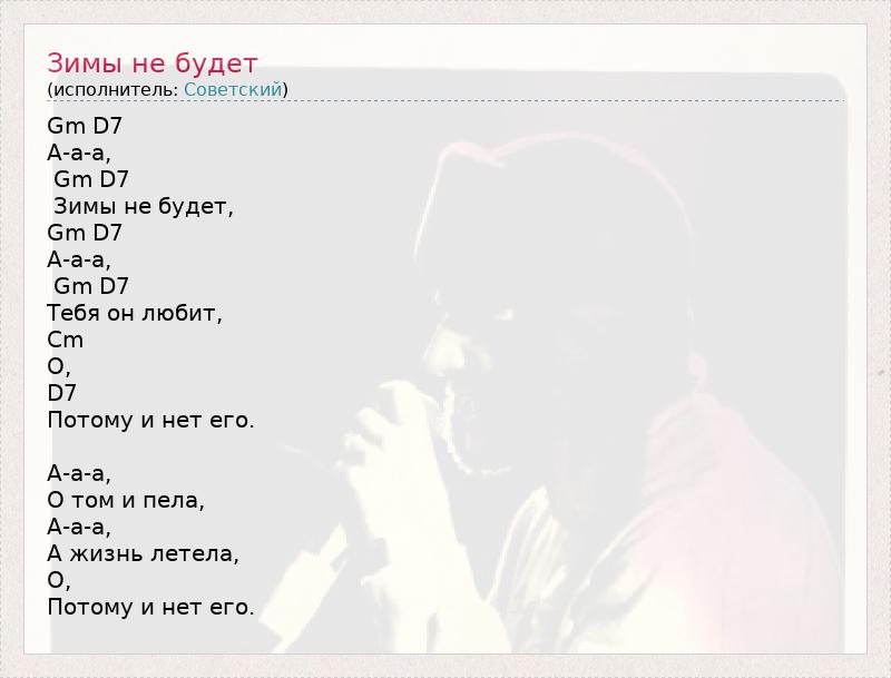 Gm D7 А-а-а, Gm D7 Зимы не будет, Gm D7 А-а-а, Gm D7 Тебя он любит, Cm О, D7 Потому и нет его. А-а-а, О том и пела, А-а-а, А жизнь летела, О, Потому и нет его.