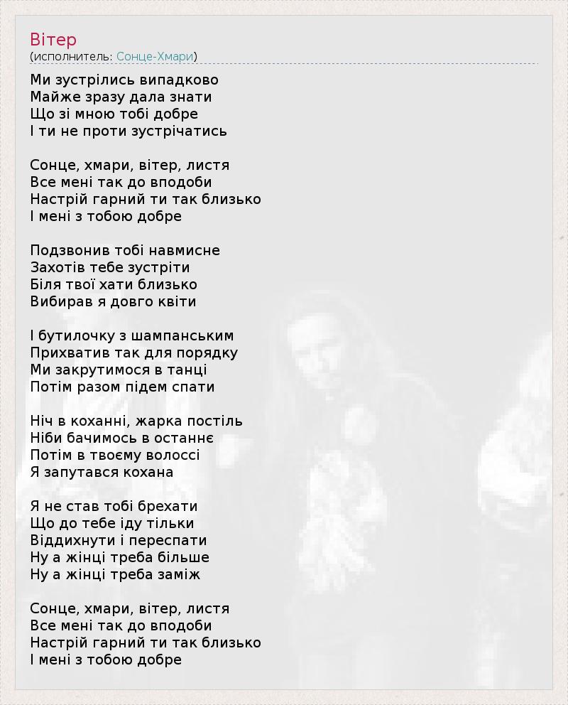 Ми зустрілись випадково Майже зразу дала знати Що зі мною тобі добре І ти не проти зустрічатись Сонце, хмари, вітер, листя Все мені так до вподоби Настрій гарний ти так близько І мені з тобою добре Подзвонив тобі навмисне Захотів тебе зустріти Біля твої хати близько Вибирав я довго квіти І бутилочку з шампанським Прихватив так для порядку Ми закрутимося в танці Потім разом підем спати Ніч в коханні, жарка постіль Ніби бачимось в останнє Потім в твоєму волоссі Я запутався кохана Я не став тобі брехати Що до тебе іду тільки Віддихнути і переспати Ну а жінці треба більше Ну а жінці треба заміж Сонце, хмари, вітер, листя Все мені так до вподоби Настрій гарний ти так близько І мені з тобою добре