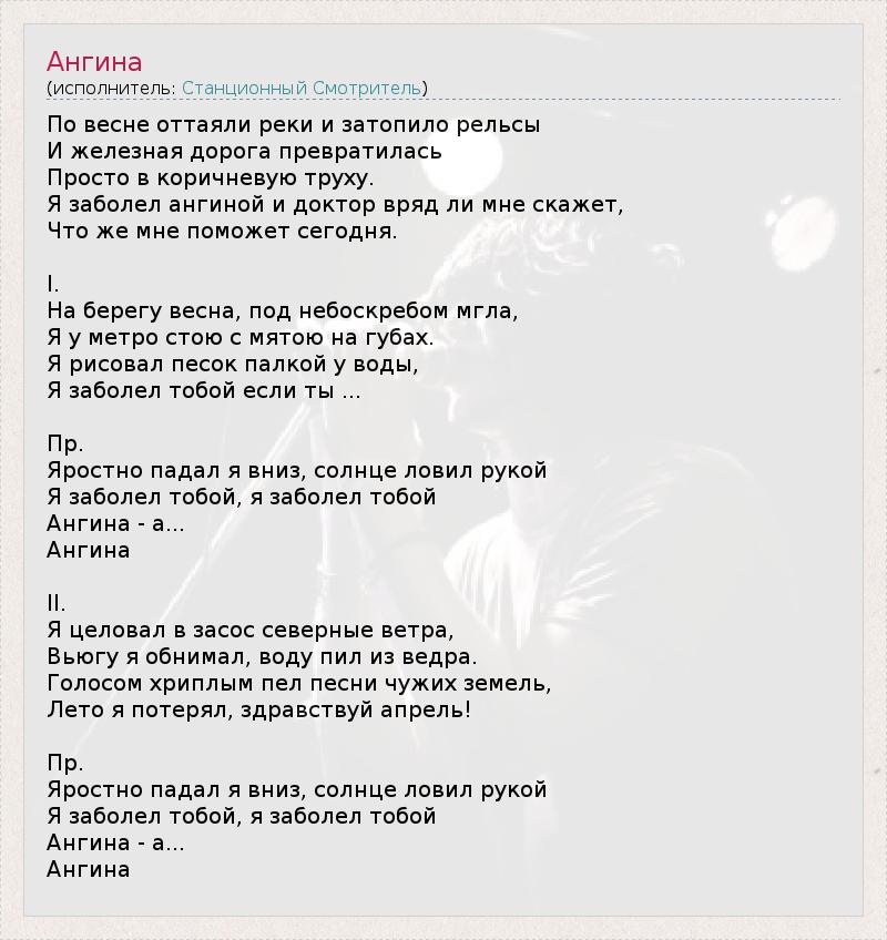 По весне оттаяли реки и затопило рельсы И железная дорога превратилась Просто в коричневую труху. Я заболел ангиной и доктор вряд ли мне скажет, Что же мне поможет сегодня. I. На берегу весна, под небоскребом мгла, Я у метро стою с мятою на губах. Я рисовал песок палкой у воды, Я заболел тобой если ты ... Пр. Яростно падал я вниз, солнце ловил рукой Я заболел тобой, я заболел тобой Ангина - а... Ангина II. Я целовал в засос северные ветра, Вьюгу я обнимал, воду пил из ведра. Голосом хриплым пел песни чужих земель, Лето я потерял, здравствуй апрель! Пр. Яростно падал я вниз, солнце ловил рукой Я заболел тобой, я заболел тобой Ангина - а... Ангина