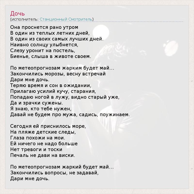 Она проснется рано утром В один из теплых летних дней, В один из своих самых лучших дней. Наивно солнцу улыбнется, Слезу уронит на постель, Биенье, слыша в животе своем. По метеопрогнозам жарким будет май… Закончились морозы, весну встречай Дари мне дочь. Теряю время и сон в ожидании, Прилагаю усилий кучу, старания, Попадаю ногой в лужу, видно старый уже, Да и зрачки сужены. Я знаю, кто тебе нужен, Давай не будем про мужа, садись, поужинаем. Сегодня ей приснилось море, На пляже детские следы, Глаза похожи на мои. Ей ничего не надо больше Нет тревоги и тоски Печаль не дави на виски. По метеопрогнозам жаркий будет май… Закончились вопросы, не задавай, Дари мне дочь.