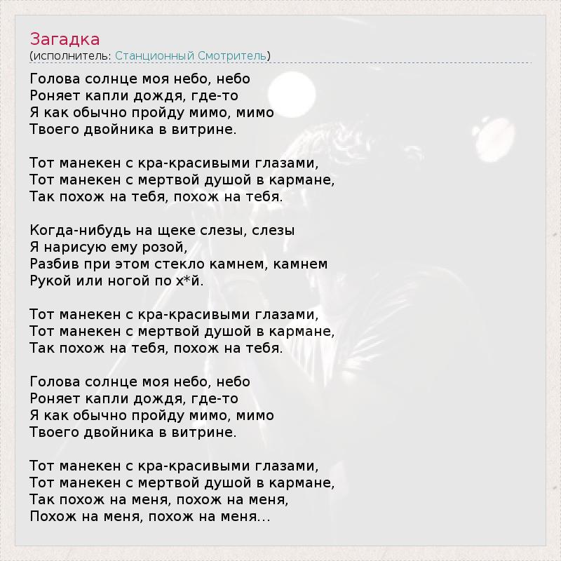 Голова солнце моя небо, небо Роняет капли дождя, где-то Я как обычно пройду мимо, мимо Твоего двойника в витрине. Тот манекен с кра-красивыми глазами, Тот манекен с мертвой душой в кармане, Так похож на тебя, похож на тебя. Когда-нибудь на щеке слезы, слезы Я нарисую ему розой, Разбив при этом стекло камнем, камнем Рукой или ногой по х*й. Тот манекен с кра-красивыми глазами, Тот манекен с мертвой душой в кармане, Так похож на тебя, похож на тебя. Голова солнце моя небо, небо Роняет капли дождя, где-то Я как обычно пройду мимо, мимо Твоего двойника в витрине. Тот манекен с кра-красивыми глазами, Тот манекен с мертвой душой в кармане, Так похож на меня, похож на меня, Похож на меня, похож на меня…