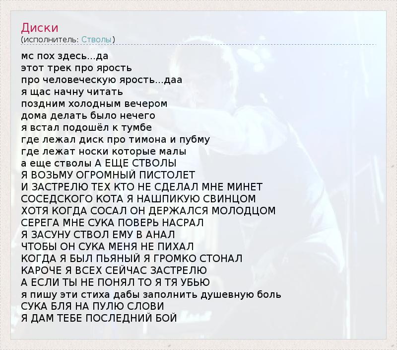 мс пох здесь...да этот трек про ярость про человеческую ярость...даа я щас начну читать поздним холодным вечером дома делать было нечего я встал подошёл к тумбе где лежал диск про тимона и пубму где лежат носки которые малы а еще стволы А ЕЩЕ СТВОЛЫ Я ВОЗЬМУ ОГРОМНЫЙ ПИСТОЛЕТ И ЗАСТРЕЛЮ ТЕХ КТО НЕ СДЕЛАЛ МНЕ МИНЕТ СОСЕДСКОГО КОТА Я НАШПИКУЮ СВИНЦОМ ХОТЯ КОГДА СОСАЛ ОН ДЕРЖАЛСЯ МОЛОДЦОМ СЕРЕГА МНЕ СУКА ПОВЕРЬ НАСРАЛ Я ЗАСУНУ СТВОЛ ЕМУ В АНАЛ ЧТОБЫ ОН СУКА МЕНЯ НЕ ПИХАЛ КОГДА Я БЫЛ ПЬЯНЫЙ Я ГРОМКО СТОНАЛ КАРОЧЕ Я ВСЕХ СЕЙЧАС ЗАСТРЕЛЮ А ЕСЛИ ТЫ НЕ ПОНЯЛ ТО Я ТЯ УБЬЮ я пишу эти стиха дабы заполнить душевную боль СУКА БЛЯ НА ПУЛЮ СЛОВИ Я ДАМ ТЕБЕ ПОСЛЕДНИЙ БОЙ