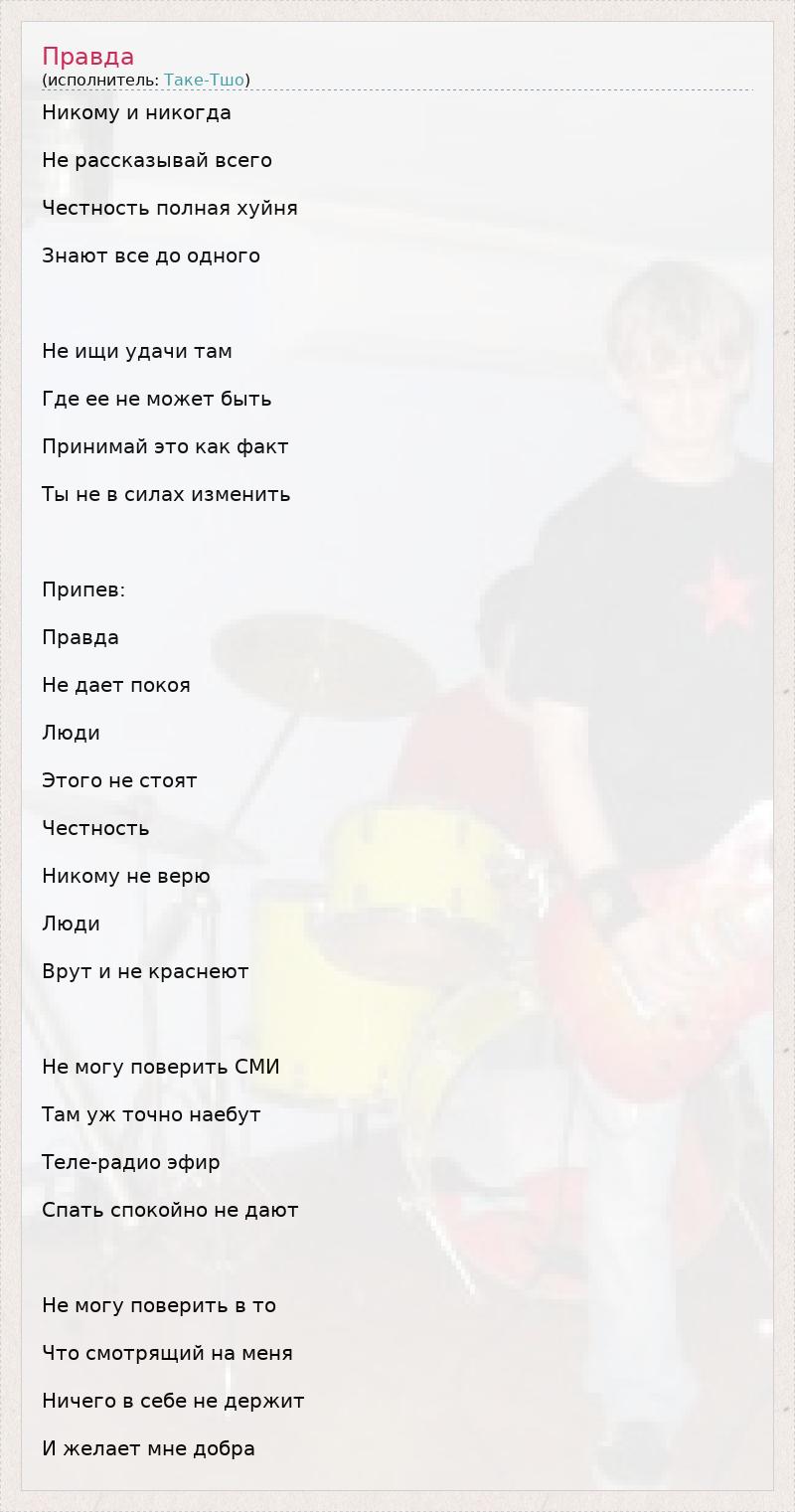 Никому и никогда Не рассказывай всего Честность полная хуйня Знают все до одного Не ищи удачи там Где ее не может быть Принимай это как факт Ты не в силах изменить Припев: Правда Не дает покоя Люди Этого не стоят Честность Никому не верю Люди Врут и не краснеют Не могу поверить СМИ Там уж точно наебут Теле-радио эфир Спать спокойно не дают Не могу поверить в то Что смотрящий на меня Ничего в себе не держит И желает мне добра