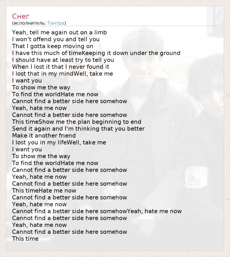 Yeah, tell me again out on a limb I won't offend you and tell you That I gotta keep moving on I have this much of timeKeeping it down under the ground I should have at least try to tell you When I lost it that I never found it I lost that in my mindWell, take me I want you To show me the way To find the worldHate me now Cannot find a better side here somehow Yeah, hate me now Cannot find a better side here somehow This timeShow me the plan beginning to end Send it again and I'm thinking that you better Make it another friend I lost you in my lifeWell, take me I want you To show me the way To find the worldHate me now Cannot find a better side here somehow Yeah, hate me now Cannot find a better side here somehow This timeHate me now Cannot find a better side here somehow Yeah, hate me now Cannot find a better side here somehowYeah, hate me now Cannot find a better side here somehow Yeah, hate me now Cannot find a better side here somehow This time