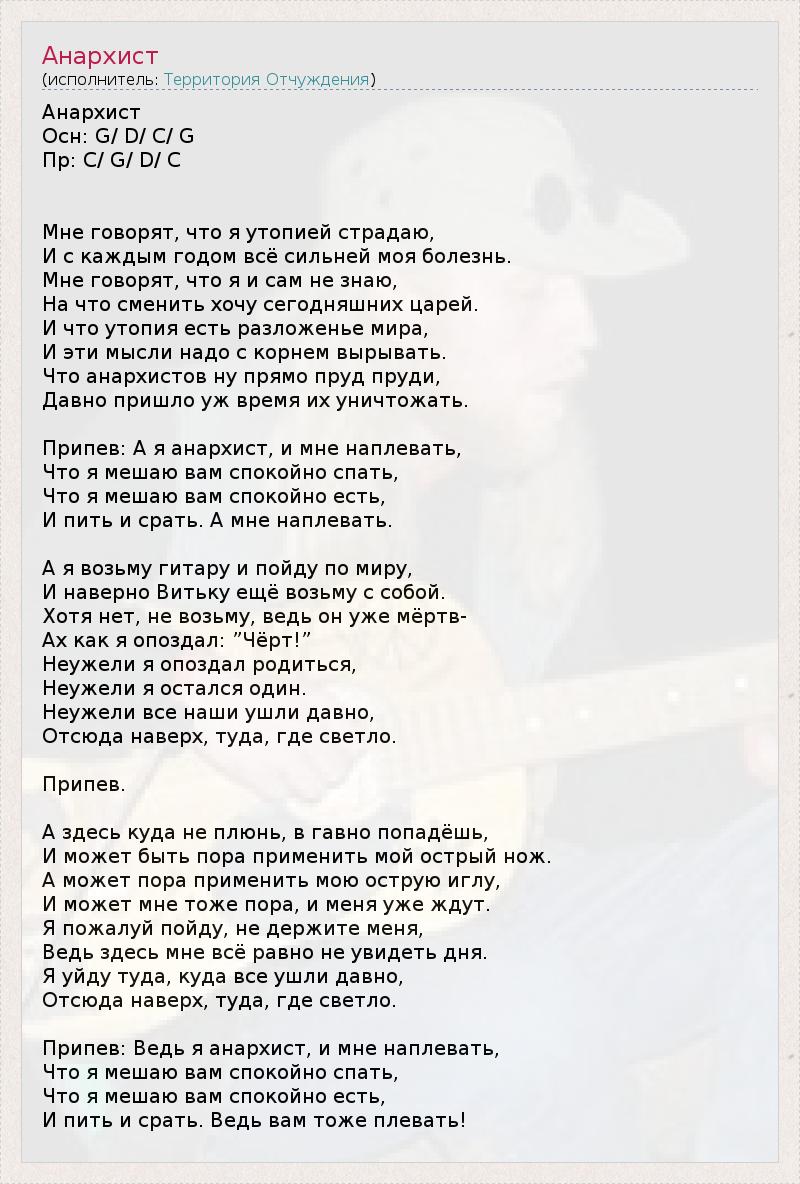 Анархист Осн: G/ D/ C/ G Пр: C/ G/ D/ C Мне говорят, что я утопией страдаю, И с каждым годом всё сильней моя болезнь. Мне говорят, что я и сам не знаю, На что сменить хочу сегодняшних царей. И что утопия есть разложенье мира, И эти мысли надо с корнем вырывать. Что анархистов ну прямо пруд пруди, Давно пришло уж время их уничтожать. Припев: А я анархист, и мне наплевать, Что я мешаю вам спокойно спать, Что я мешаю вам спокойно есть, И пить и срать. А мне наплевать. А я возьму гитару и пойду по миру, И наверно Витьку ещё возьму с собой. Хотя нет, не возьму, ведь он уже мёртв- Ах как я опоздал: ”Чёрт!” Неужели я опоздал родиться, Неужели я остался один. Неужели все наши ушли давно, Отсюда наверх, туда, где светло. Припев. А здесь куда не плюнь, в гавно попадёшь, И может быть пора применить мой острый нож. А может пора применить мою острую иглу, И может мне тоже пора, и меня уже ждут. Я пожалуй пойду, не держите меня, Ведь здесь мне всё равно не увидеть дня. Я уйду туда, куда все ушли давно, Отсюда наверх, туда, где светло. Припев: Ведь я анархист, и мне наплевать, Что я мешаю вам спокойно спать, Что я мешаю вам спокойно есть, И пить и срать. Ведь вам тоже плевать!