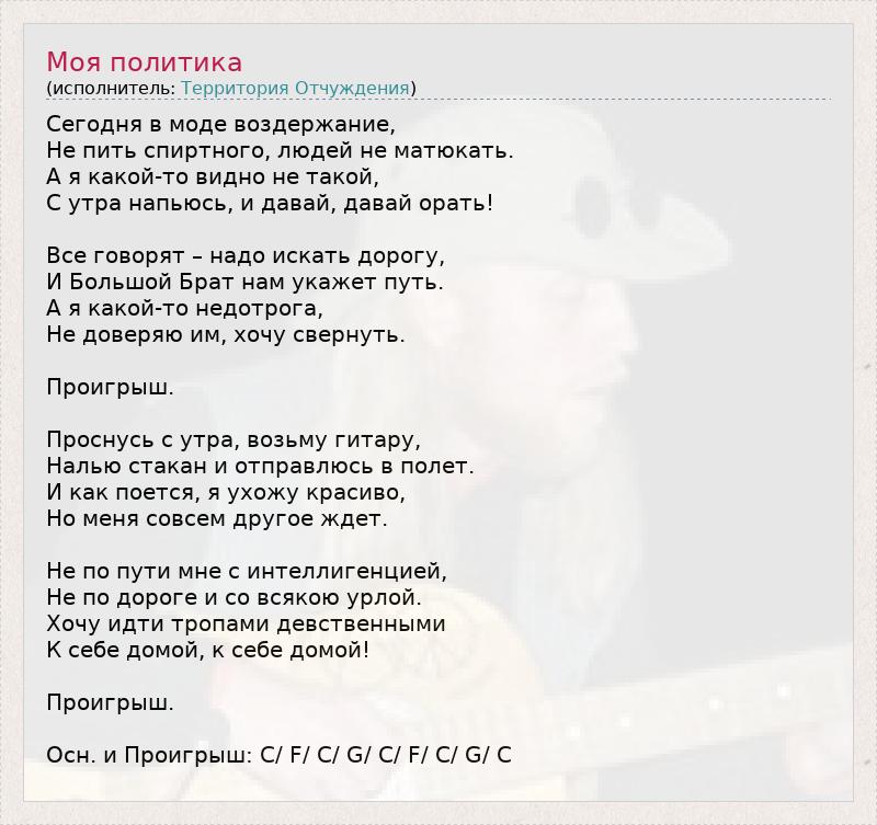 Сегодня в моде воздержание, Не пить спиртного, людей не матюкать. А я какой-то видно не такой, С утра напьюсь, и давай, давай орать! Все говорят – надо искать дорогу, И Большой Брат нам укажет путь. А я какой-то недотрога, Не доверяю им, хочу свернуть. Проигрыш. Проснусь с утра, возьму гитару, Налью стакан и отправлюсь в полет. И как поется, я ухожу красиво, Но меня совсем другое ждет. Не по пути мне с интеллигенцией, Не по дороге и со всякою урлой. Хочу идти тропами девственными К себе домой, к себе домой! Проигрыш. Осн. и Проигрыш: C/ F/ C/ G/ C/ F/ C/ G/ C