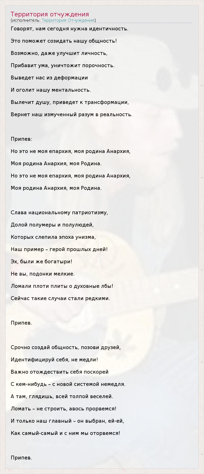 Говорят, нам сегодня нужна идентичность. Это поможет созидать нашу общность! Возможно, даже улучшит личность, Прибавит ума, уничтожит порочность. Выведет нас из деформации И оголит нашу ментальность. Вылечит душу, приведет к трансформации, Вернет наш измученный разум в реальность. Припев: Но это не моя епархия, моя родина Анархия, Моя родина Анархия, моя Родина. Но это не моя епархия, моя родина Анархия, Моя родина Анархия, моя Родина. Слава национальному патриотизму, Долой полумеры и полулюдей, Которых слепила эпоха унизма, Наш пример – герой прошлых дней! Эх, были же богатыри! Не вы, подонки мелкие. Ломали плоти плиты о духовные лбы! Сейчас такие случаи стали редкими. Припев. Срочно создай общность, позови друзей, Идентифицируй себя, не медли! Важно отождествить себя поскорей С кем-нибудь – с новой системой немедля. А там, глядишь, всей толпой веселей. Ломать – не строить, авось прорвемся! И только наш главный – он выбран, ей-ей, Как самый-самый и с ним мы оторвемся! Припев.