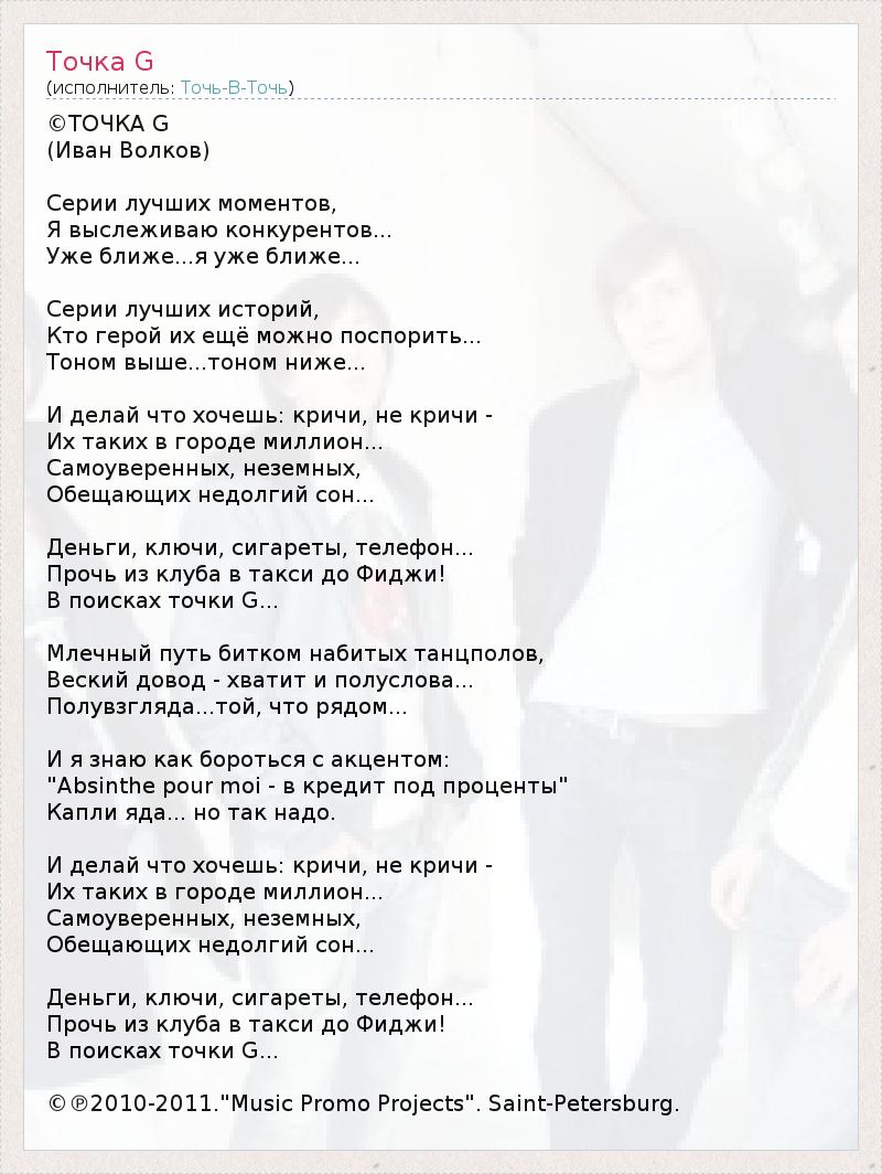 ©ТОЧКА G (Иван Волков) Серии лучших моментов, Я выслеживаю конкурентов... Уже ближе...я уже ближе... Серии лучших историй, Кто герой их ещё можно поспорить... Тоном выше...тоном ниже... И делай что хочешь: кричи, не кричи - Их таких в городе миллион... Самоуверенных, неземных, Обещающих недолгий сон... Деньги, ключи, сигареты, телефон... Прочь из клуба в такси до Фиджи! В поисках точки G... Млечный путь битком набитых танцполов, Веский довод - хватит и полуслова... Полувзгляда...той, что рядом... И я знаю как бороться с акцентом: "Absinthe pour moi - в кредит под проценты" Капли яда... но так надо. И делай что хочешь: кричи, не кричи - Их таких в городе миллион... Самоуверенных, неземных, Обещающих недолгий сон... Деньги, ключи, сигареты, телефон... Прочь из клуба в такси до Фиджи! В поисках точки G... ©℗2010-2011."Music Promo Projects". Saint-Petersburg.