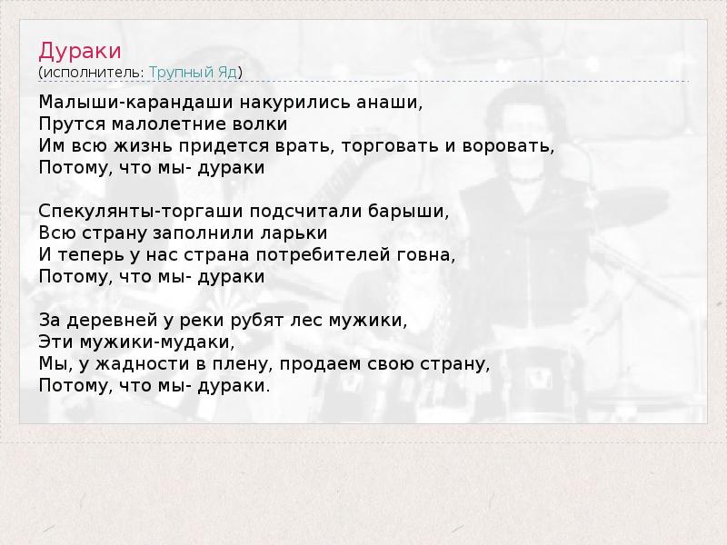 Малыши-карандаши накурились анаши, Прутся малолетние волки Им всю жизнь придется врать, торговать и воровать, Потому, что мы- дураки Спекулянты-торгаши подсчитали барыши, Всю страну заполнили ларьки И теперь у нас страна потребителей говна, Потому, что мы- дураки За деревней у реки рубят лес мужики, Эти мужики-мудаки, Мы, у жадности в плену, продаем свою страну, Потому, что мы- дураки.