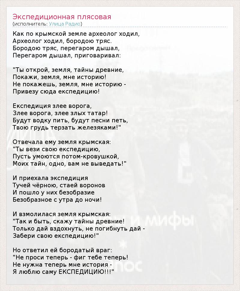 Как по крымской земле археолог ходил, Археолог ходил, бородою тряс. Бородою тряс, перегаром дышал, Перегаром дышал, приговаривал: "Ты открой, земля, тайны древние, Покажи, земля, мне историю! Не покажешь, земля, мне историю - Привезу сюда експедицию! Експедиция злее ворога, Злее ворога, злее злых татар! Будут водку пить, будут песни петь, Твою грудь терзать железяками!" Отвечала ему земля крымская: "Ты вези свою експедицию, Пусть умоются потом-кровушкой, Моих тайн, одно, вам не выведать!" И приехала экспедиция Тучей чёрною, стаей воронов И пошло у них безобразие Безобразное с утра до ночи! И взмолилася земля крымская: "Так и быть, скажу тайны древние! Только дай вздохнуть, не погибнуть дай - Забери свою експедицию!" Но ответил ей бородатый враг: "Не проси теперь - фиг тебе теперь! Не нужна теперь мне история - Я люблю саму ЕКСПЕДИЦИЮ!!!"