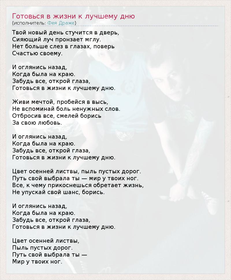 Твой новый день стучится в дверь, Сияющий луч пронзает мглу. Нет больше слез в глазах, поверь Счастью своему. И оглянись назад, Когда была на краю. Забудь все, открой глаза, Готовься в жизни к лучшему дню. Живи мечтой, пробейся в высь, Не вспоминай боль ненужных слов. Отбросив все, смелей борись За свою любовь. И оглянись назад, Когда была на краю. Забудь все, открой глаза, Готовься в жизни к лучшему дню. Цвет осенней листвы, пыль пустых дорог. Путь свой выбрала ты — мир у твоих ног. Все, к чему прикоснешься обретает жизнь, Не упускай свой шанс, борись. И оглянись назад, Когда была на краю. Забудь все, открой глаза, Готовься в жизни к лучшему дню. Цвет осенней листвы, Пыль пустых дорог. Путь свой выбрала ты — Мир у твоих ног.
