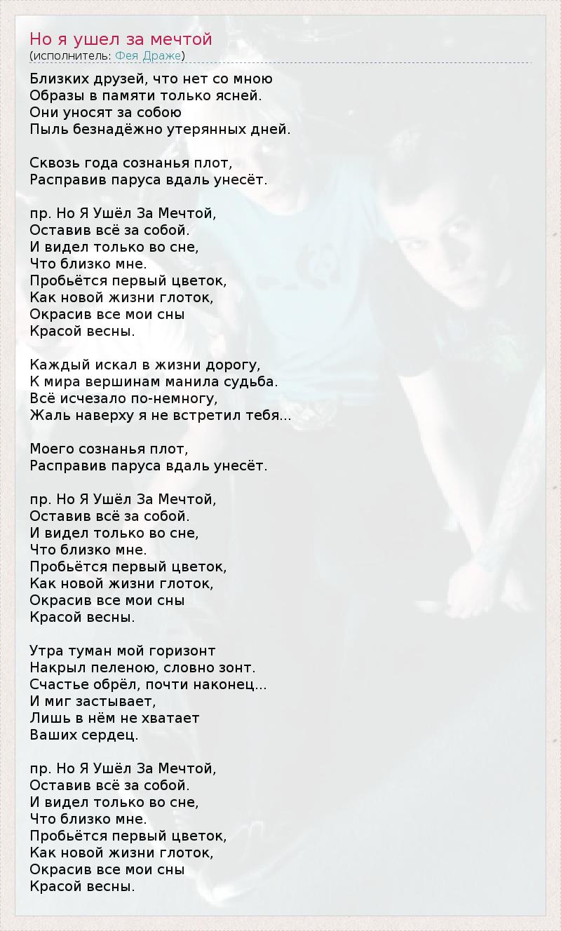 Близких друзей, что нет со мною Образы в памяти только ясней. Они уносят за собою Пыль безнадёжно утерянных дней. Сквозь года сознанья плот, Расправив паруса вдаль унесёт. пр. Но Я Ушёл За Мечтой, Оставив всё за собой. И видел только во сне, Что близко мне. Пробьётся первый цветок, Как новой жизни глоток, Окрасив все мои сны Красой весны. Каждый искал в жизни дорогу, К мира вершинам манила судьба. Всё исчезало по-немногу, Жаль наверху я не встретил тебя... Моего сознанья плот, Расправив паруса вдаль унесёт. пр. Но Я Ушёл За Мечтой, Оставив всё за собой. И видел только во сне, Что близко мне. Пробьётся первый цветок, Как новой жизни глоток, Окрасив все мои сны Красой весны. Утра туман мой горизонт Накрыл пеленою, словно зонт. Счастье обрёл, почти наконец... И миг застывает, Лишь в нём не хватает Ваших сердец. пр. Но Я Ушёл За Мечтой, Оставив всё за собой. И видел только во сне, Что близко мне. Пробьётся первый цветок, Как новой жизни глоток, Окрасив все мои сны Красой весны.