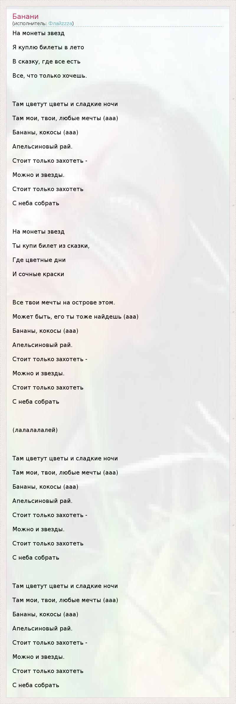 На монеты звезд Я куплю билеты в лето В сказку, где все есть Все, что только хочешь. Там цветут цветы и сладкие ночи Там мои, твои, любые мечты (ааа) Бананы, кокосы (ааа) Апельсиновый рай. Стоит только захотеть - Можно и звезды. Стоит только захотеть С неба собрать На монеты звезд Ты купи билет из сказки, Где цветные дни И сочные краски Все твои мечты на острове этом. Может быть, его ты тоже найдешь (ааа) Бананы, кокосы (ааа) Апельсиновый рай. Стоит только захотеть - Можно и звезды. Стоит только захотеть С неба собрать (лалалалалей) Там цветут цветы и сладкие ночи Там мои, твои, любые мечты (ааа) Бананы, кокосы (ааа) Апельсиновый рай. Стоит только захотеть - Можно и звезды. Стоит только захотеть С неба собрать Там цветут цветы и сладкие ночи Там мои, твои, любые мечты (ааа) Бананы, кокосы (ааа) Апельсиновый рай. Стоит только захотеть - Можно и звезды. Стоит только захотеть С неба собрать