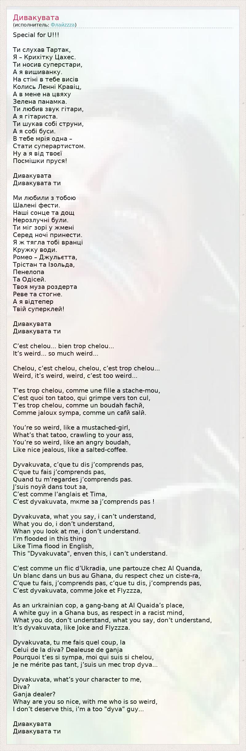 Special for U!!! Ти слухав Тартак, Я – Крихітку Цахес. Ти носив суперстари, А я вишиванку. На стіні в тебе висів Колись Ленні Кравіц, А в мене на цвяху Зелена панамка. Ти любив звук гітари, А я гітариста. Ти шукав собі струни, А я собі буси. В тебе мрія одна – Стати суперартистом. Ну а я від твоєї Посмішки пруся! Дивакувата Дивакувата ти Ми любили з тобою Шалені фести. Наші сонце та дощ Нерозлучні були. Ти міг зорі у жмені Серед ночі принести. Я ж тягла тобі вранці Кружку води. Ромео – Джульєтта, Трістан та Ізольда, Пенелопа Та Одісей. Твоя муза роздерта Реве та стогне. А я відтепер Твій суперклей! Дивакувата Дивакувата ти C’est chelou... bien trop chelou... It’s weird... so much weird... Chelou, c’est chelou, chelou, c’est trop chelou... Weird, it’s weird, weird, c’est too weird... T’es trop chelou, comme une fille а stache-mou, C’est quoi ton tatoo, qui grimpe vers ton cul, T’es trop chelou, comme un boudah fachй, Comme jaloux sympa, comme un cafй salй. You’re so weird, like a mustached-girl, What’s that tatoo, crawling to your ass, You’re so weird, like an angry boudah, Like nice jealous, like a salted-coffee. Dyvakuvata, c’que tu dis j’comprends pas, C’que tu fais j’comprends pas, Quand tu m’regardes j’comprends pas. J’suis noyй dans tout зa, C’est comme l’anglais et Tima, C’est dyvakuvata, mкme зa j’comprends pas ! Dyvakuvata, what you say, i can’t understand, What you do, i don’t understand, Whan you look at me, i don’t understand. I’m flooded in this thing Like Tima flood in English, This "Dyvakuvata", enven this, i can’t understand. C’est comme un flic d’Ukradia, une partouze chez Al Quaпda, Un blanc dans un bus au Ghana, du respect chez un ciste-ra, C’que tu fais, j’comprends pas, c’que tu dis, j’comprends pas, C’est dyvakuvata, comme Joke et Flyzzza, As an urkrainian cop, a gang-bang at Al Quaida’s place, A white guy in a Ghana bus, as respect in a racist mind, What you do, don’t understand, what you say, don’t understand, It’s dyvakuvata, like Joke and Flyzzza. Dyvakuvata, tu me fais quel coup, lа Celui de la diva? Dealeuse de ganja Pourquoi t’es si sympa, moi qui suis si chelou, Je ne mérite pas tant, j’suis un mec trop dyva... Dyvakuvata, what’s your character to me, Diva? Ganja dealer? Whay are you so nice, with me who is so weird, I don’t deserve this, i’m a too "dyva" guy... Дивакувата Дивакувата ти