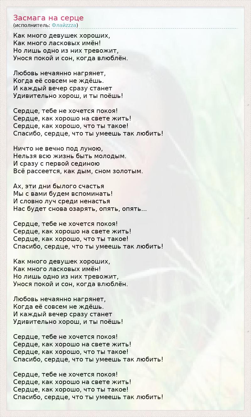 Как много девушек хороших, Как много ласковых имён! Но лишь одно из них тревожит, Унося покой и сон, когда влюблён. Любовь нечаянно нагрянет, Когда её совсем не ждёшь. И каждый вечер сразу станет Удивительно хорош, и ты поёшь! Сердце, тебе не хочется покоя! Сердце, как хорошо на свете жить! Сердце, как хорошо, что ты такое! Спасибо, сердце, что ты умеешь так любить! Ничто не вечно под луною, Нельзя всю жизнь быть молодым. И сразу с первой сединою Всё рассеется, как дым, сном золотым. Ах, эти дни былого счастья Мы с вами будем вспоминать! И словно луч среди ненастья Нас будет снова озарять, опять, опять... Сердце, тебе не хочется покоя! Сердце, как хорошо на свете жить! Сердце, как хорошо, что ты такое! Спасибо, сердце, что ты умеешь так любить! Как много девушек хороших, Как много ласковых имён! Но лишь одно из них тревожит, Унося покой и сон, когда влюблён. Любовь нечаянно нагрянет, Когда её совсем не ждёшь. И каждый вечер сразу станет Удивительно хорош, и ты поёшь! Сердце, тебе не хочется покоя! Сердце, как хорошо на свете жить! Сердце, как хорошо, что ты такое! Спасибо, сердце, что ты умеешь так любить! Сердце, тебе не хочется покоя! Сердце, как хорошо на свете жить! Сердце, как хорошо, что ты такое! Спасибо, сердце, что ты умеешь так любить!