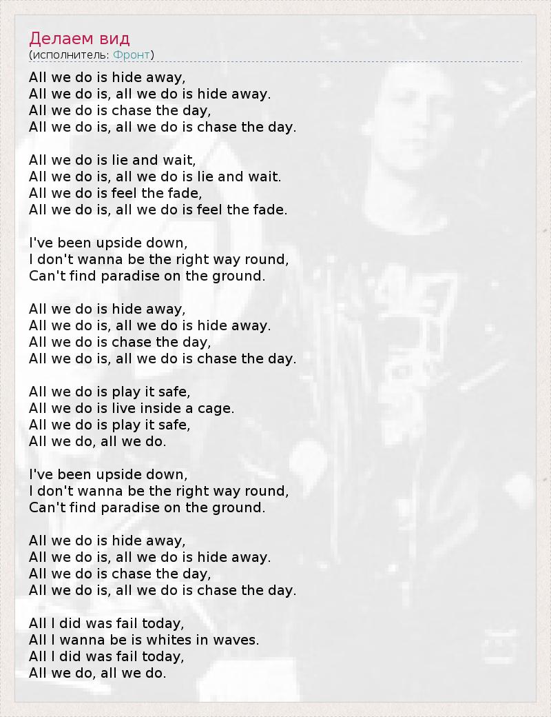 Мы только и делаем, что прячемся, Мы только и делаем, мы только и делаем, что прячемся. Мы только и делаем, что гонимся за днём. Мы только и делаем, мы только и делаем, что гонимся за днём. Мы только и делаем, что лжём и ждём, Мы только и делаем, мы только и делаем, что лжём и ждём. Мы только и делаем, что ощущаем приход, Мы только и делаем, мы только и делаем, что ощущаем приход. Я вверх тормашками, Я не хочу быть в правильном положении, На земле не найти рая. Мы только и делаем, что прячемся, Мы только и делаем, мы только и делаем, что прячемся. Мы только и делаем, что гонимся за днём. Мы только и делаем, мы только и делаем, что гонимся за днём. Мы только и делаем, что не рискуем, Мы только и делаем, что живём в клетке. Мы только и делаем, что не рискуем, Мы только и делаем, мы только и делаем. Я вверх тормашками, Я не хочу быть в правильном положении, На земле не найти рая. Мы только и делаем, что прячемся, Мы только и делаем, мы только и делаем, что прячемся. Мы только и делаем, что гонимся за днём. Мы только и делаем, мы только и делаем, что гонимся за днём. Сегодня я только и делал, что терпел неудачи, Я хочу быть пеной в волнах. Сегодня я только и делал, что терпел неудачи, Мы только и делаем, мы только и делаем.