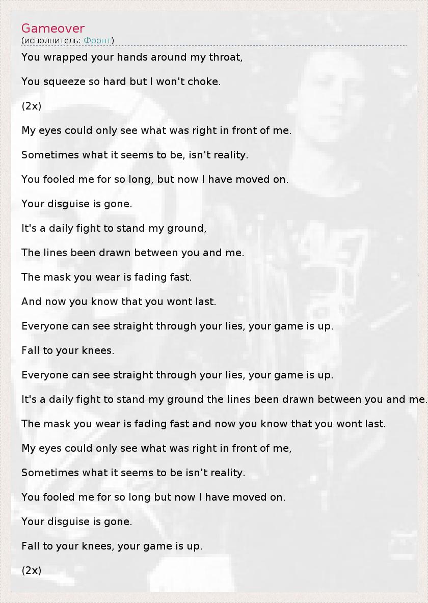 You wrapped your hands around my throat, You squeeze so hard but I won't choke. (2x) My eyes could only see what was right in front of me. Sometimes what it seems to be, isn't reality. You fooled me for so long, but now I have moved on. Your disguise is gone. It's a daily fight to stand my ground, The lines been drawn between you and me. The mask you wear is fading fast. And now you know that you wont last. Everyone can see straight through your lies, your game is up. Fall to your knees. Everyone can see straight through your lies, your game is up. It's a daily fight to stand my ground the lines been drawn between you and me. The mask you wear is fading fast and now you know that you wont last. My eyes could only see what was right in front of me, Sometimes what it seems to be isn't reality. You fooled me for so long but now I have moved on. Your disguise is gone. Fall to your knees, your game is up. (2x)