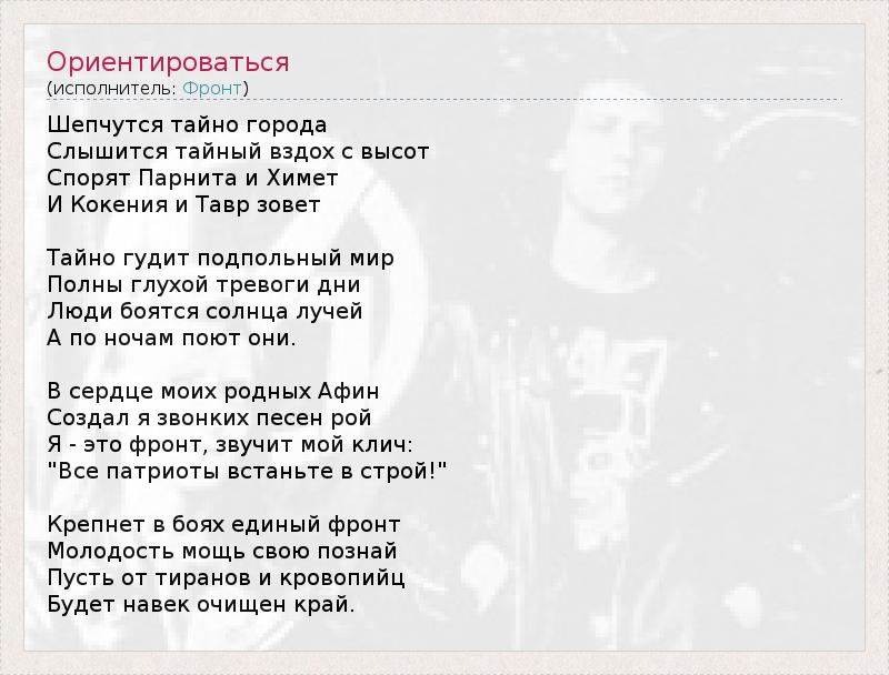 Шепчутся тайно города Слышится тайный вздох с высот Спорят Парнита и Химет И Кокения и Тавр зовет Тайно гудит подпольный мир Полны глухой тревоги дни Люди боятся солнца лучей А по ночам поют они. В сердце моих родных Афин Создал я звонких песен рой Я - это фронт, звучит мой клич: "Все патриоты встаньте в строй!" Крепнет в боях единый фронт Молодость мощь свою познай Пусть от тиранов и кровопийц Будет навек очищен край.