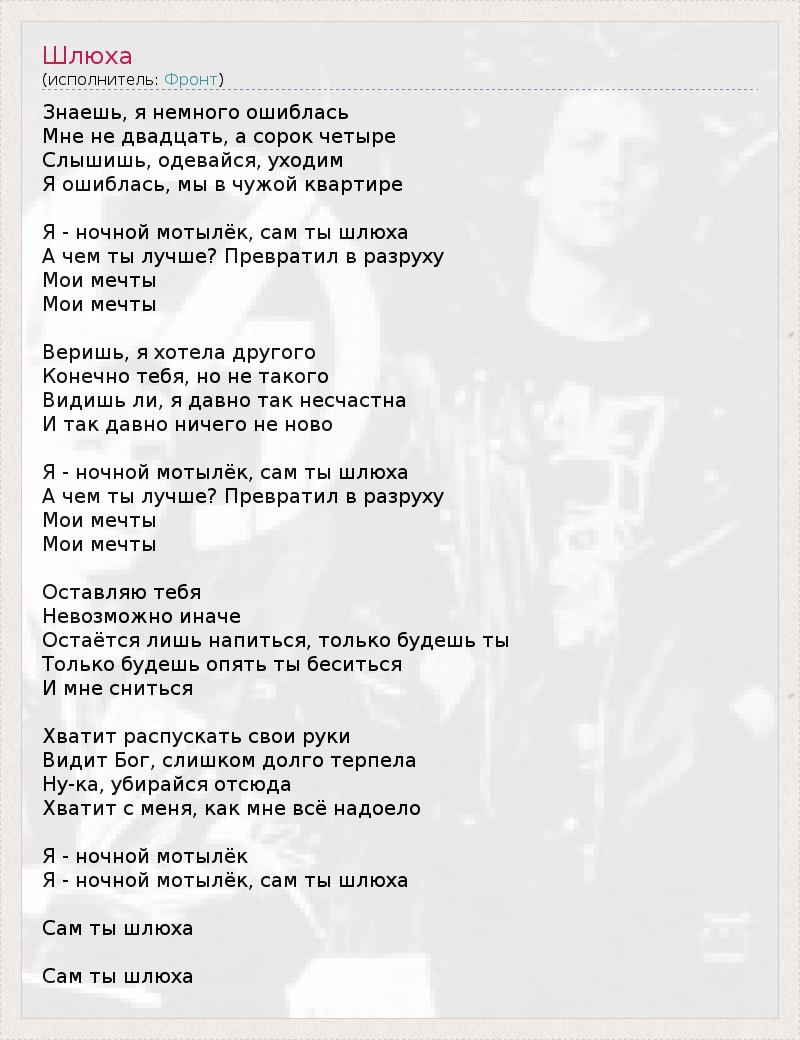 Знаешь, я немного ошиблась Мне не двадцать, а сорок четыре Слышишь, одевайся, уходим Я ошиблась, мы в чужой квартире Я - ночной мотылёк, сам ты шлюха А чем ты лучше? Превратил в разруху Мои мечты Мои мечты Веришь, я хотела другого Конечно тебя, но не такого Видишь ли, я давно так несчастна И так давно ничего не ново Я - ночной мотылёк, сам ты шлюха А чем ты лучше? Превратил в разруху Мои мечты Мои мечты Оставляю тебя Невозможно иначе Остаётся лишь напиться, только будешь ты Только будешь опять ты беситься И мне сниться Хватит распускать свои руки Видит Бог, слишком долго терпела Ну-ка, убирайся отсюда Хватит с меня, как мне всё надоело Я - ночной мотылёк Я - ночной мотылёк, сам ты шлюха Сам ты шлюха Сам ты шлюха