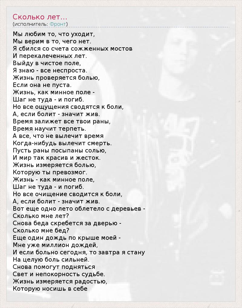 Мы любим то, что уходит, Мы верим в то, чего нет. Я сбился со счета сожженных мостов И перекалеченных лет. Выйду в чистое поле, Я знаю - все неспроста. Жизнь проверяется болью, Если она не пуста. Жизнь, как минное поле - Шаг не туда - и погиб. Но все ощущения сводятся к боли, А, если болит - значит жив. Время залижет все твои раны, Время научит терпеть. А все, что не вылечит время Когда-нибудь вылечит смерть. Пусть раны посыпаны солью, И мир так красив и жесток. Жизнь измеряется болью, Которую ты превозмог. Жизнь - как минное поле, Шаг не туда - и погиб. Но все очищение сводится к боли, А, если болит - значит жив. Вот еще одно лето облетело с деревьев - Сколько мне лет? Снова беда скребется за дверью - Сколько мне бед? Еще один дождь по крыше моей - Мне уже миллион дождей, И если больно сегодня, то завтра я стану На целую боль сильней. Снова помогут подняться Свет и непокорность судьбе. Жизнь измеряется радостью, Которую носишь в себе