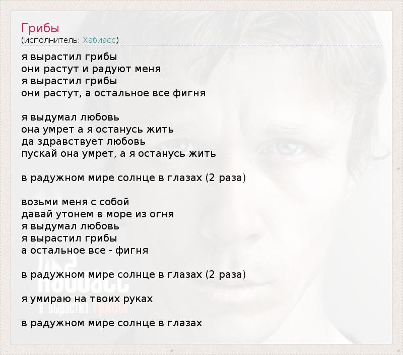 я вырастил грибы они растут и радуют меня я вырастил грибы они растут, а остальное все фигня я выдумал любовь она умрет а я останусь жить да здравствует любовь пускай она умрет, а я останусь жить в радужном мире солнце в глазах (2 раза) возьми меня с собой давай утонем в море из огня я выдумал любовь я вырастил грибы а остальное все - фигня в радужном мире солнце в глазах (2 раза) я умираю на твоих руках в радужном мире солнце в глазах