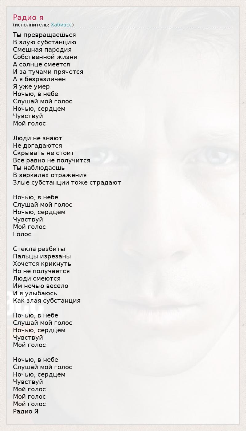 Ты превращаешься В злую субстанцию Смешная пародия Собственной жизни А солнце смеется И за тучами прячется А я безразличен Я уже умер Ночью, в небе Слушай мой голос Ночью, сердцем Чувствуй Мой голос Люди не знают Не догадаются Скрывать не стоит Все равно не получится Ты наблюдаешь В зеркалах отражения Злые субстанции тоже страдают Ночью, в небе Слушай мой голос Ночью, сердцем Чувствуй Мой голос Голос Стекла разбиты Пальцы изрезаны Хочется крикнуть Но не получается Люди смеются Им ночью весело И я улыбаюсь Как злая субстанция Ночью, в небе Слушай мой голос Ночью, сердцем Чувствуй Мой голос Ночью, в небе Слушай мой голос Ночью, сердцем Чувствуй Мой голос Мой голос Мой голос Радио Я