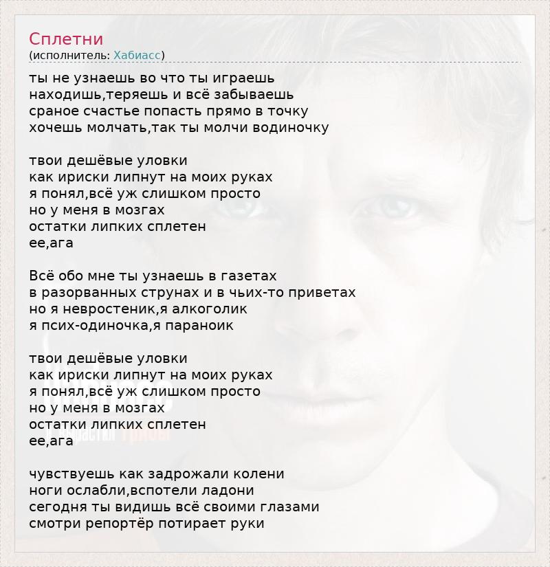 ты не узнаешь во что ты играешь находишь,теряешь и всё забываешь сраное счастье попасть прямо в точку хочешь молчать,так ты молчи водиночку твои дешёвые уловки как ириски липнут на моих руках я понял,всё уж слишком просто но у меня в мозгах остатки липких сплетен ее,ага Всё обо мне ты узнаешь в газетах в разорванных струнах и в чьих-то приветах но я невростеник,я алкоголик я псих-одиночка,я параноик твои дешёвые уловки как ириски липнут на моих руках я понял,всё уж слишком просто но у меня в мозгах остатки липких сплетен ее,ага чувствуешь как задрожали колени ноги ослабли,вспотели ладони сегодня ты видишь всё своими глазами смотри репортёр потирает руки