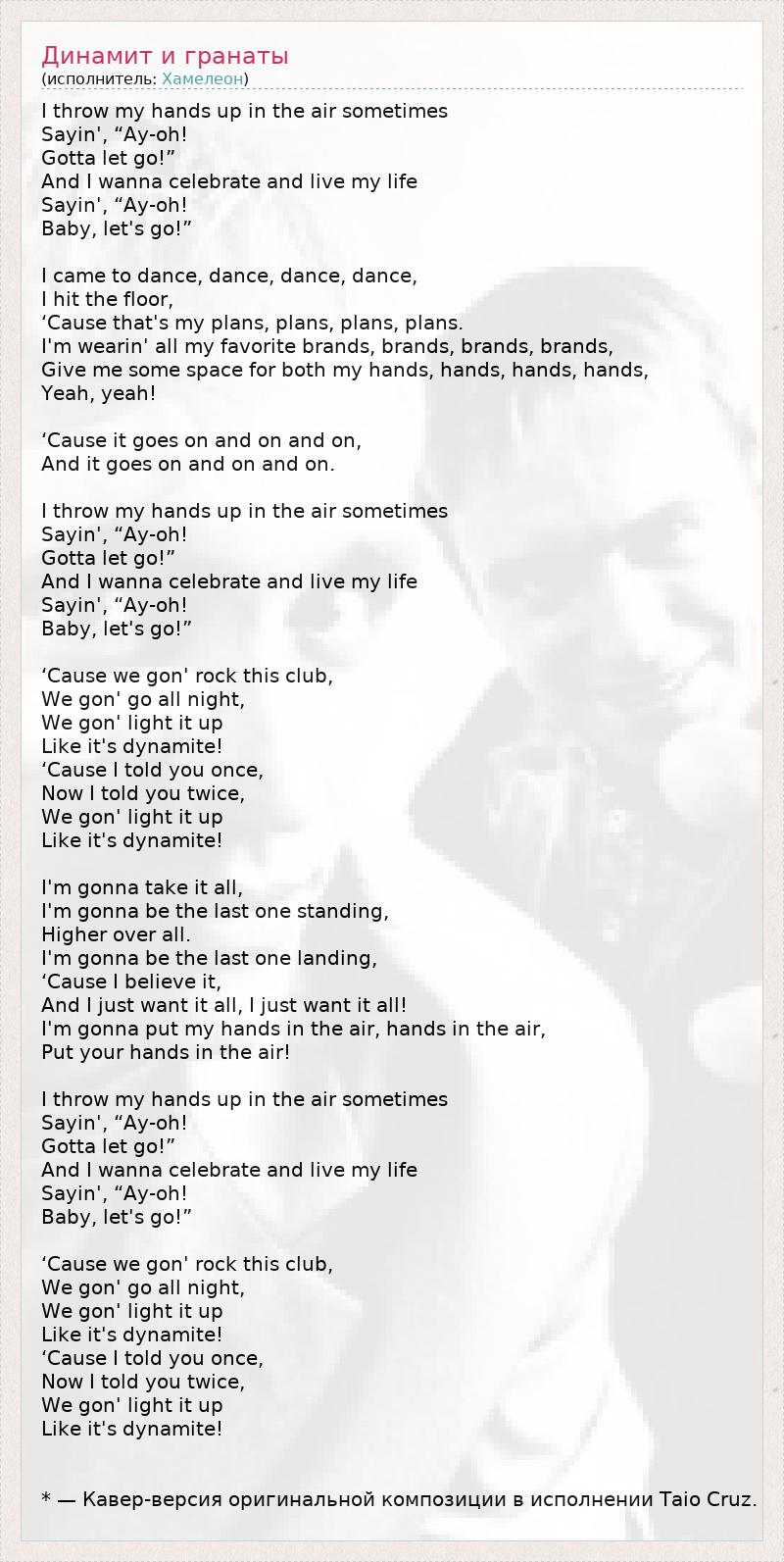 I throw my hands up in the air sometimes Sayin', “Ay-oh! Gotta let go!” And I wanna celebrate and live my life Sayin', “Ay-oh! Baby, let's go!” I came to dance, dance, dance, dance, I hit the floor, ‘Cause that's my plans, plans, plans, plans. I'm wearin' all my favorite brands, brands, brands, brands, Give me some space for both my hands, hands, hands, hands, Yeah, yeah! ‘Cause it goes on and on and on, And it goes on and on and on. I throw my hands up in the air sometimes Sayin', “Ay-oh! Gotta let go!” And I wanna celebrate and live my life Sayin', “Ay-oh! Baby, let's go!” ‘Cause we gon' rock this club, We gon' go all night, We gon' light it up Like it's dynamite! ‘Cause I told you once, Now I told you twice, We gon' light it up Like it's dynamite! I'm gonna take it all, I'm gonna be the last one standing, Higher over all. I'm gonna be the last one landing, ‘Cause I believe it, And I just want it all, I just want it all! I'm gonna put my hands in the air, hands in the air, Put your hands in the air! I throw my hands up in the air sometimes Sayin', “Ay-oh! Gotta let go!” And I wanna celebrate and live my life Sayin', “Ay-oh! Baby, let's go!” ‘Cause we gon' rock this club, We gon' go all night, We gon' light it up Like it's dynamite! ‘Cause I told you once, Now I told you twice, We gon' light it up Like it's dynamite! * — Кавер-версия оригинальной композиции в исполнении Taio Cruz.
