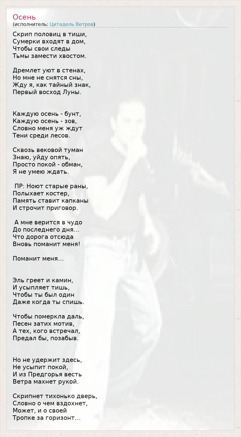 Скрип половиц в тиши, Сумерки входят в дом, Чтобы свои следы Тьмы замести хвостом. Дремлет уют в стенах, Но мне не снятся сны, Жду я, как тайный знак, Первый восход Луны. Каждую осень - бунт, Каждую осень - зов, Словно меня уж ждут Тени среди лесов. Сквозь вековой туман Знаю, уйду опять, Просто покой - обман, Я не умею ждать. ПР: Ноют старые раны, Полыхает костер, Память ставит капканы И строчит приговор. А мне верится в чудо До последнего дня… Что дорога отсюда Вновь поманит меня! Поманит меня… Эль греет и камин, И усыпляет тишь, Чтобы ты был один Даже когда ты спишь. Чтобы померкла даль, Песен затих мотив, А тех, кого встречал, Предал бы, позабыв. Но не удержит здесь, Не усыпит покой, И из Предгорья весть Ветра махнет рукой. Скрипнет тихонько дверь, Словно о чем вздохнет, Может, и о своей Тропке за горизонт…
