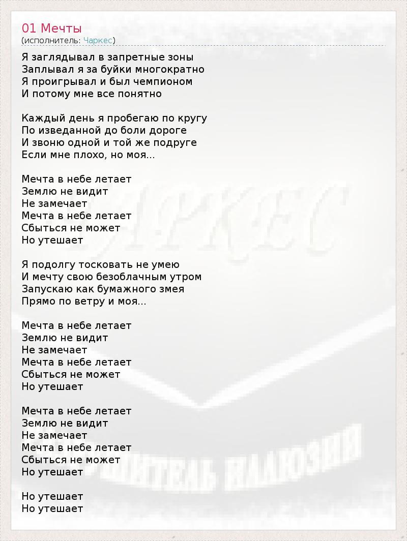 Я заглядывал в запретные зоны Заплывал я за буйки многократно Я проигрывал и был чемпионом И потому мне все понятно Каждый день я пробегаю по кругу По изведанной до боли дороге И звоню одной и той же подруге Если мне плохо, но моя... Мечта в небе летает Землю не видит Не замечает Мечта в небе летает Сбыться не может Но утешает Я подолгу тосковать не умею И мечту свою безоблачным утром Запускаю как бумажного змея Прямо по ветру и моя... Мечта в небе летает Землю не видит Не замечает Мечта в небе летает Сбыться не может Но утешает Мечта в небе летает Землю не видит Не замечает Мечта в небе летает Сбыться не может Но утешает Но утешает Но утешает