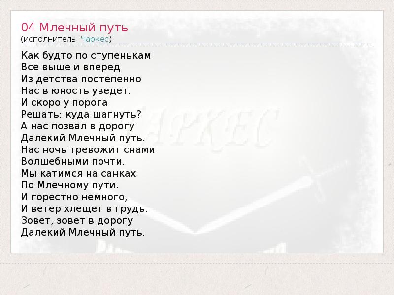 Как будто по ступенькам Все выше и вперед Из детства постепенно Нас в юность уведет. И скоро у порога Решать: куда шагнуть? А нас позвал в дорогу Далекий Млечный путь. Нас ночь тревожит снами Волшебными почти. Мы катимся на санках По Млечному пути. И горестно немного, И ветер хлещет в грудь. Зовет, зовет в дорогу Далекий Млечный путь.
