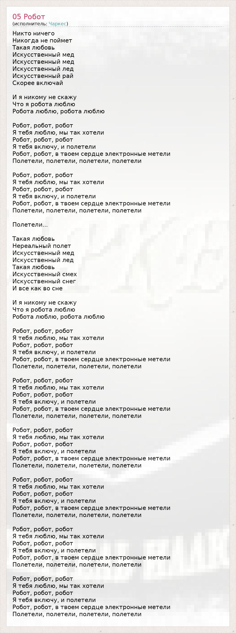 Никто ничего Никогда не поймет Такая любовь Искусственный мед Искусственный мед Искусственный лед Искусственный рай Скорее включай И я никому не скажу Что я робота люблю Робота люблю, робота люблю Робот, робот, робот Я тебя люблю, мы так хотели Робот, робот, робот Я тебя включу, и полетели Робот, робот, в твоем сердце электронные метели Полетели, полетели, полетели, полетели Робот, робот, робот Я тебя люблю, мы так хотели Робот, робот, робот Я тебя включу, и полетели Робот, робот, в твоем сердце электронные метели Полетели, полетели, полетели, полетели Полетели... Такая любовь Нереальный полет Искусственный мед Искусственный лед Такая любовь Искусственный смех Искусственный снег И все как во сне И я никому не скажу Что я робота люблю Робота люблю, робота люблю Робот, робот, робот Я тебя люблю, мы так хотели Робот, робот, робот Я тебя включу, и полетели Робот, робот, в твоем сердце электронные метели Полетели, полетели, полетели, полетели Робот, робот, робот Я тебя люблю, мы так хотели Робот, робот, робот Я тебя включу, и полетели Робот, робот, в твоем сердце электронные метели Полетели, полетели, полетели, полетели Робот, робот, робот Я тебя люблю, мы так хотели Робот, робот, робот Я тебя включу, и полетели Робот, робот, в твоем сердце электронные метели Полетели, полетели, полетели, полетели Робот, робот, робот Я тебя люблю, мы так хотели Робот, робот, робот Я тебя включу, и полетели Робот, робот, в твоем сердце электронные метели Полетели, полетели, полетели, полетели Робот, робот, робот Я тебя люблю, мы так хотели Робот, робот, робот Я тебя включу, и полетели Робот, робот, в твоем сердце электронные метели Полетели, полетели, полетели, полетели Робот, робот, робот Я тебя люблю, мы так хотели Робот, робот, робот Я тебя включу, и полетели Робот, робот, в твоем сердце электронные метели Полетели, полетели, полетели, полетели