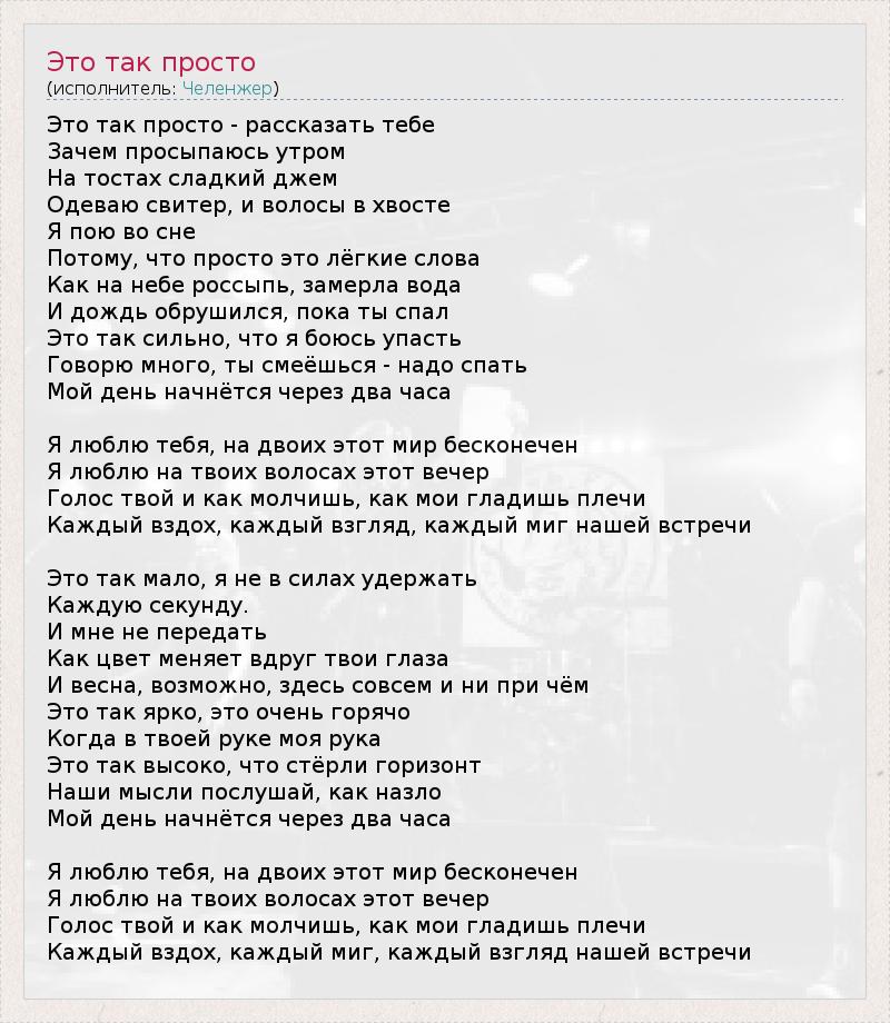 Это так просто - рассказать тебе Зачем просыпаюсь утром На тостах сладкий джем Одеваю свитер, и волосы в хвосте Я пою во сне Потому, что просто это лёгкие слова Как на небе россыпь, замерла вода И дождь обрушился, пока ты спал Это так сильно, что я боюсь упасть Говорю много, ты смеёшься - надо спать Мой день начнётся через два часа Я люблю тебя, на двоих этот мир бесконечен Я люблю на твоих волосах этот вечер Голос твой и как молчишь, как мои гладишь плечи Каждый вздох, каждый взгляд, каждый миг нашей встречи Это так мало, я не в силах удержать Каждую секунду. И мне не передать Как цвет меняет вдруг твои глаза И весна, возможно, здесь совсем и ни при чём Это так ярко, это очень горячо Когда в твоей руке моя рука Это так высоко, что стёрли горизонт Наши мысли послушай, как назло Мой день начнётся через два часа Я люблю тебя, на двоих этот мир бесконечен Я люблю на твоих волосах этот вечер Голос твой и как молчишь, как мои гладишь плечи Каждый вздох, каждый миг, каждый взгляд нашей встречи