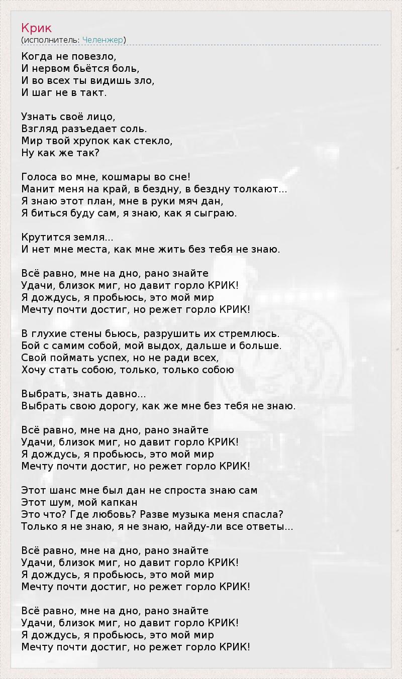 Когда не повезло, И нервом бьётся боль, И во всех ты видишь зло, И шаг не в такт. Узнать своё лицо, Взгляд разъедает соль. Мир твой хрупок как стекло, Ну как же так? Голоса во мне, кошмары во сне! Манит меня на край, в бездну, в бездну толкают... Я знаю этот план, мне в руки мяч дан, Я биться буду сам, я знаю, как я сыграю. Крутится земля... И нет мне места, как мне жить без тебя не знаю. Всё равно, мне на дно, рано знайте Удачи, близок миг, но давит горло КРИК! Я дождусь, я пробьюсь, это мой мир Мечту почти достиг, но режет горло КРИК! В глухие стены бьюсь, разрушить их стремлюсь. Бой с самим собой, мой выдох, дальше и больше. Свой поймать успех, но не ради всех, Хочу стать собою, только, только собою Выбрать, знать давно... Выбрать свою дорогу, как же мне без тебя не знаю. Всё равно, мне на дно, рано знайте Удачи, близок миг, но давит горло КРИК! Я дождусь, я пробьюсь, это мой мир Мечту почти достиг, но режет горло КРИК! Этот шанс мне был дан не спроста знаю сам Этот шум, мой капкан Это что? Где любовь? Разве музыка меня спасла? Только я не знаю, я не знаю, найду-ли все ответы... Всё равно, мне на дно, рано знайте Удачи, близок миг, но давит горло КРИК! Я дождусь, я пробьюсь, это мой мир Мечту почти достиг, но режет горло КРИК! Всё равно, мне на дно, рано знайте Удачи, близок миг, но давит горло КРИК! Я дождусь, я пробьюсь, это мой мир Мечту почти достиг, но режет горло КРИК!