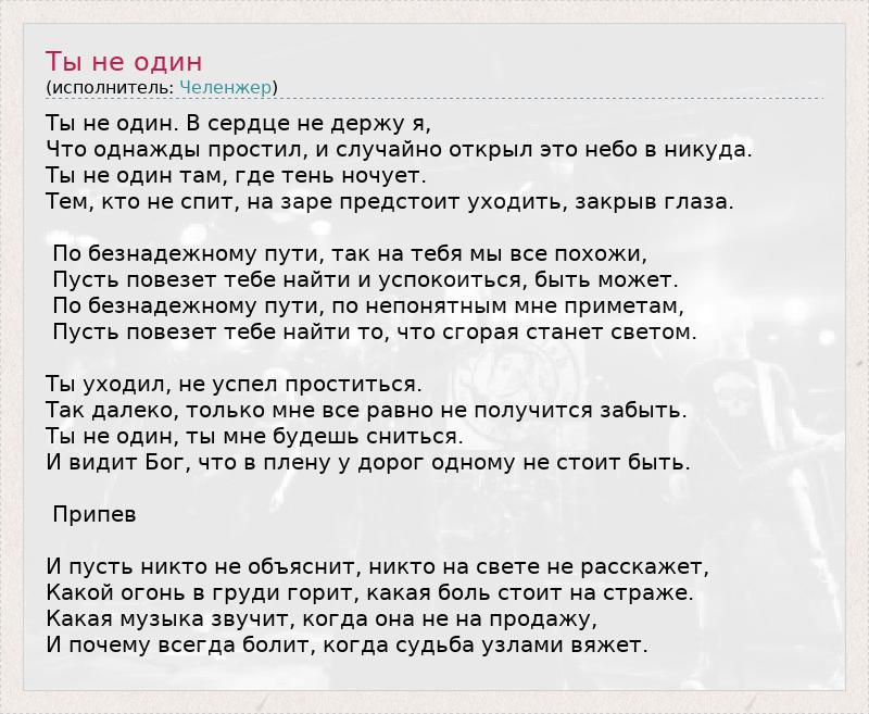 Ты не один. В сердце не держу я, Что однажды простил, и случайно открыл это небо в никуда. Ты не один там, где тень ночует. Тем, кто не спит, на заре предстоит уходить, закрыв глаза. По безнадежному пути, так на тебя мы все похожи, Пусть повезет тебе найти и успокоиться, быть может. По безнадежному пути, по непонятным мне приметам, Пусть повезет тебе найти то, что сгорая станет светом. Ты уходил, не успел проститься. Так далеко, только мне все равно не получится забыть. Ты не один, ты мне будешь сниться. И видит Бог, что в плену у дорог одному не стоит быть. Припев И пусть никто не объяснит, никто на свете не расскажет, Какой огонь в груди горит, какая боль стоит на страже. Какая музыка звучит, когда она не на продажу, И почему всегда болит, когда судьба узлами вяжет.