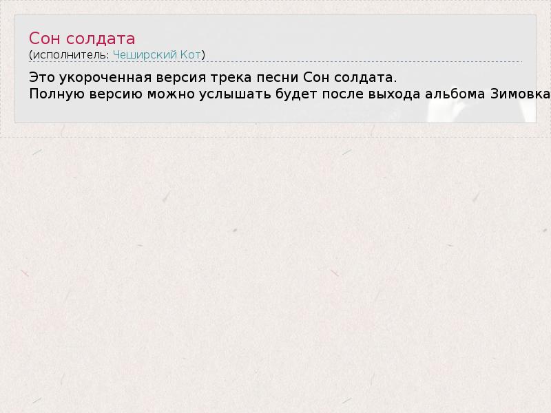 Это укороченная версия трека песни Сон солдата. Полную версию можно услышать будет после выхода альбома Зимовка