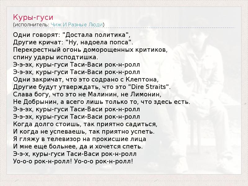 Одни говорят: "Достала политика", Другие кричат: "Ну, надоела попса". Перекрестный огонь доморощенных критиков, спину удары исподтишка. Э-э-эх, куры-гуси Таси-Васи рок-н-ролл Э-э-эх, куры-гуси Таси-Васи рок-н-ролл Одни закричат, что это содрано с Клептона, Другие будут утверждать, что это "Dire Straits". Слава богу, что это не Малинин, не Лимонин, Не Добрынин, а всего лишь только то, что здесь есть. Э-э-эх, куры-гуси Таси-Васи рок-н-ролл Э-э-эх, куры-гуси Таси-Васи рок-н-ролл Когда долго стоишь, так приятно садиться, И когда не успеваешь, так приятно успеть. Я гляжу в телевизор на прокисшие лица И мне еще больнее, да и хочется спеть. Э-э-х, куры-гуси Таси-Васи рок-н-ролл Уо-о-о рок-н-ролл! Уо-о-о рок-н-ролл!
