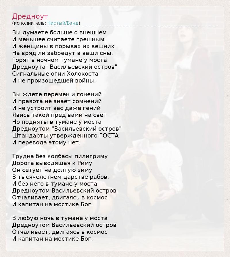 Вы думаете больше о внешнем И меньшее считаете грешным. И женщины в порывах их вешних На вряд ли забредут в ваши сны. Горят в ночном тумане у моста Дредноута "Васильевский остров" Сигнальные огни Холокоста И не произошедшей войны. Вы ждете перемен и гонений И правота не знает сомнений И не устроит вас даже гений Явись такой пред вами на свет Но подняты в тумане у моста Дредноутом "Васильевский остров" Штандарты утвержденного ГОСТА И перевода этому нет. Трудна без колбасы пилигриму Дорога выводящая к Риму Он сетует на долгую зиму В тысячелетнем царстве рабов. И без него в тумане у моста Дредноутом Васильевский остров Отчаливает, двигаясь в космос И капитан на мостике Бог. В любую ночь в тумане у моста Дредноутом Васильевский остров Отчаливает, двигаясь в космос И капитан на мостике Бог.