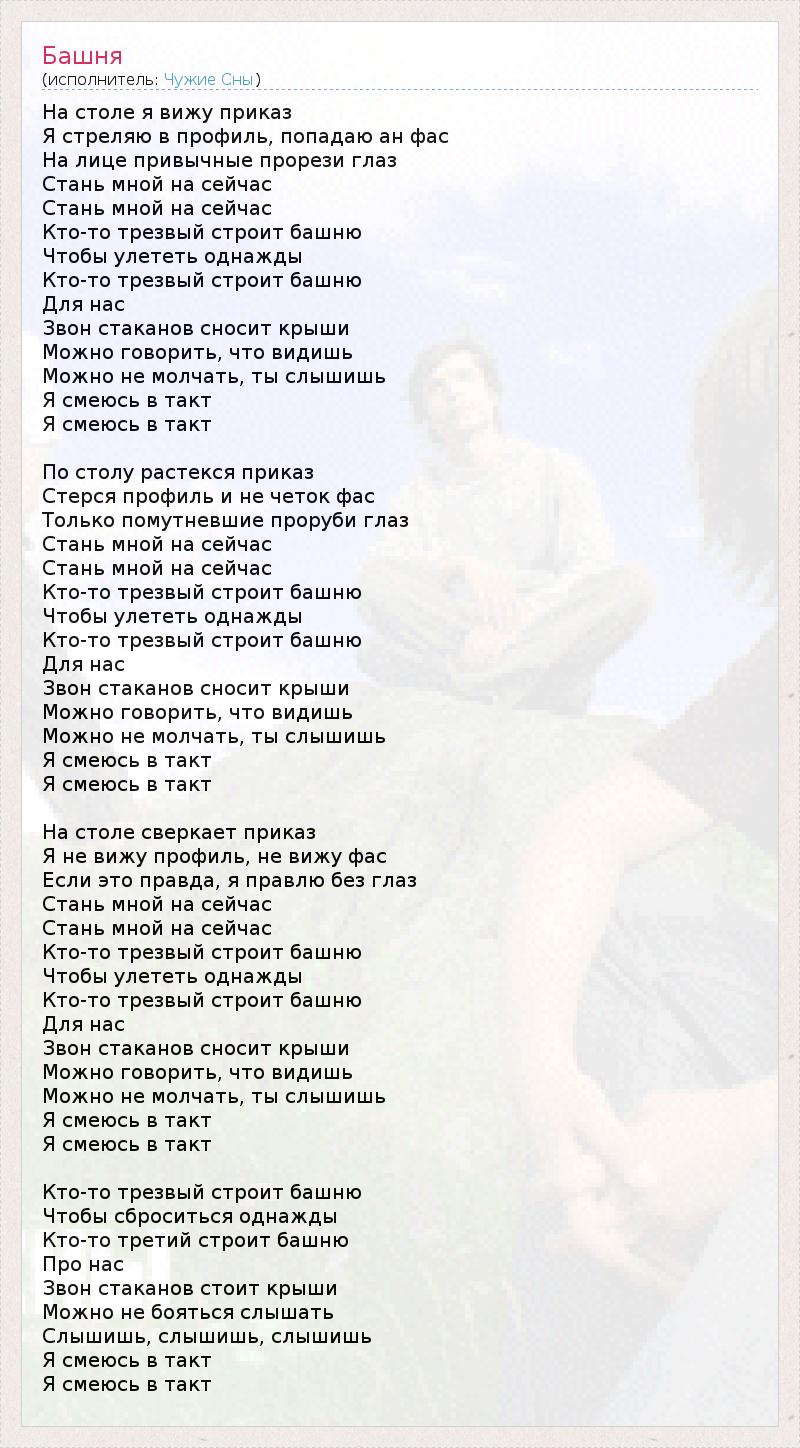 На столе я вижу приказ Я стреляю в профиль, попадаю ан фас На лице привычные прорези глаз Стань мной на сейчас Стань мной на сейчас Кто-то трезвый строит башню Чтобы улететь однажды Кто-то трезвый строит башню Для нас Звон стаканов сносит крыши Можно говорить, что видишь Можно не молчать, ты слышишь Я смеюсь в такт Я смеюсь в такт По столу растекся приказ Стерся профиль и не четок фас Только помутневшие проруби глаз Стань мной на сейчас Стань мной на сейчас Кто-то трезвый строит башню Чтобы улететь однажды Кто-то трезвый строит башню Для нас Звон стаканов сносит крыши Можно говорить, что видишь Можно не молчать, ты слышишь Я смеюсь в такт Я смеюсь в такт На столе сверкает приказ Я не вижу профиль, не вижу фас Если это правда, я правлю без глаз Стань мной на сейчас Стань мной на сейчас Кто-то трезвый строит башню Чтобы улететь однажды Кто-то трезвый строит башню Для нас Звон стаканов сносит крыши Можно говорить, что видишь Можно не молчать, ты слышишь Я смеюсь в такт Я смеюсь в такт Кто-то трезвый строит башню Чтобы сброситься однажды Кто-то третий строит башню Про нас Звон стаканов стоит крыши Можно не бояться слышать Слышишь, слышишь, слышишь Я смеюсь в такт Я смеюсь в такт