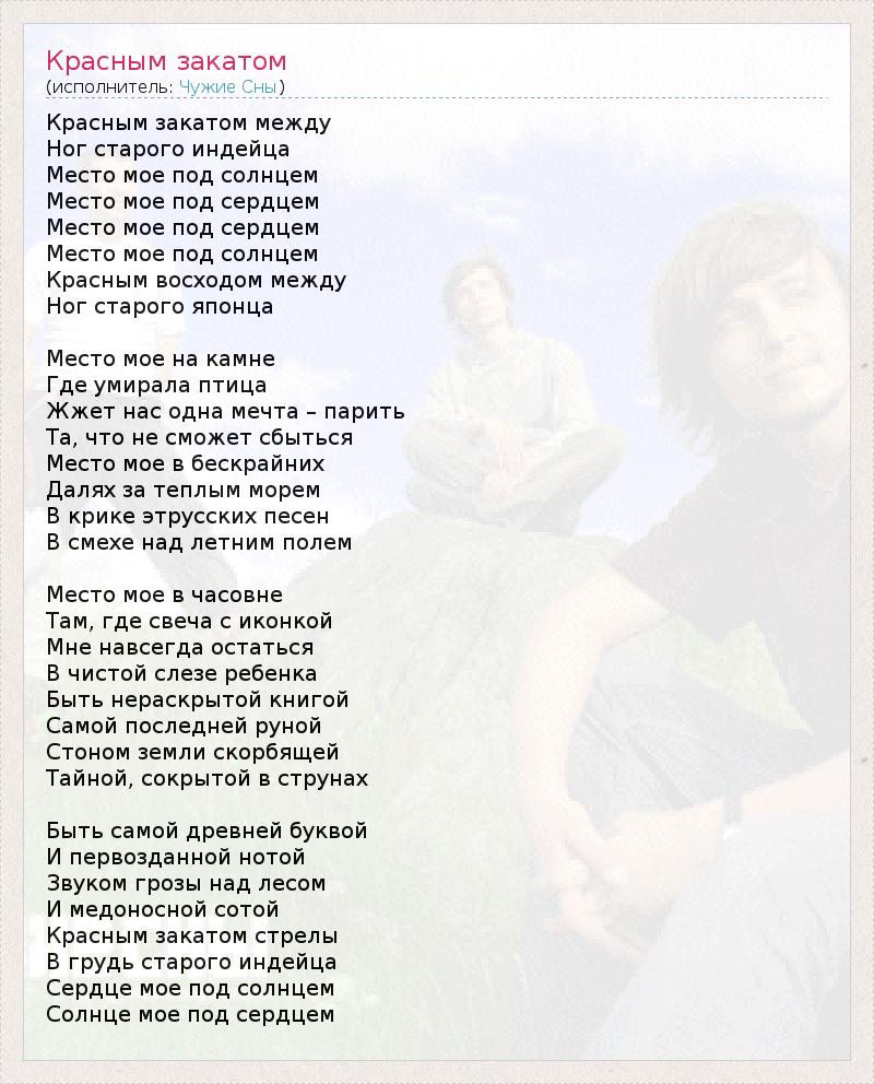 Красным закатом между Ног старого индейца Место мое под солнцем Место мое под сердцем Место мое под сердцем Место мое под солнцем Красным восходом между Ног старого японца Место мое на камне Где умирала птица Жжет нас одна мечта – парить Та, что не сможет сбыться Место мое в бескрайних Далях за теплым морем В крике этруccких песен В смехе над летним полем Место мое в часовне Там, где свеча с иконкой Мне навсегда остаться В чистой слезе ребенка Быть нераскрытой книгой Самой последней руной Стоном земли скорбящей Тайной, сокрытой в струнах Быть самой древней буквой И первозданной нотой Звуком грозы над лесом И медоносной сотой Красным закатом стрелы В грудь старого индейца Сердце мое под солнцем Солнце мое под сердцем